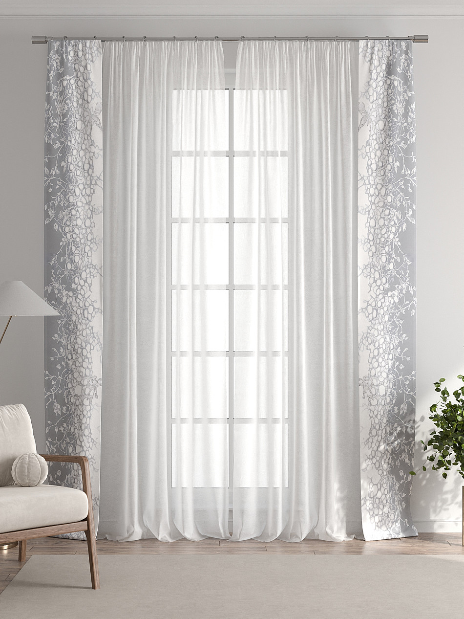 В комплект входят: - 2 полотна белого тюля шириной 150 см.. и высотой 260 см и - 2 узкие шторы шириной всего 38 см. и длиной 260 см., которые навешиваются рядом с тюлем не утяжеляя вид окна и не препятствуя попаданию солнечного света в комнату. При этом выполняют роль подхватов и добавляют акцент в интерьер.