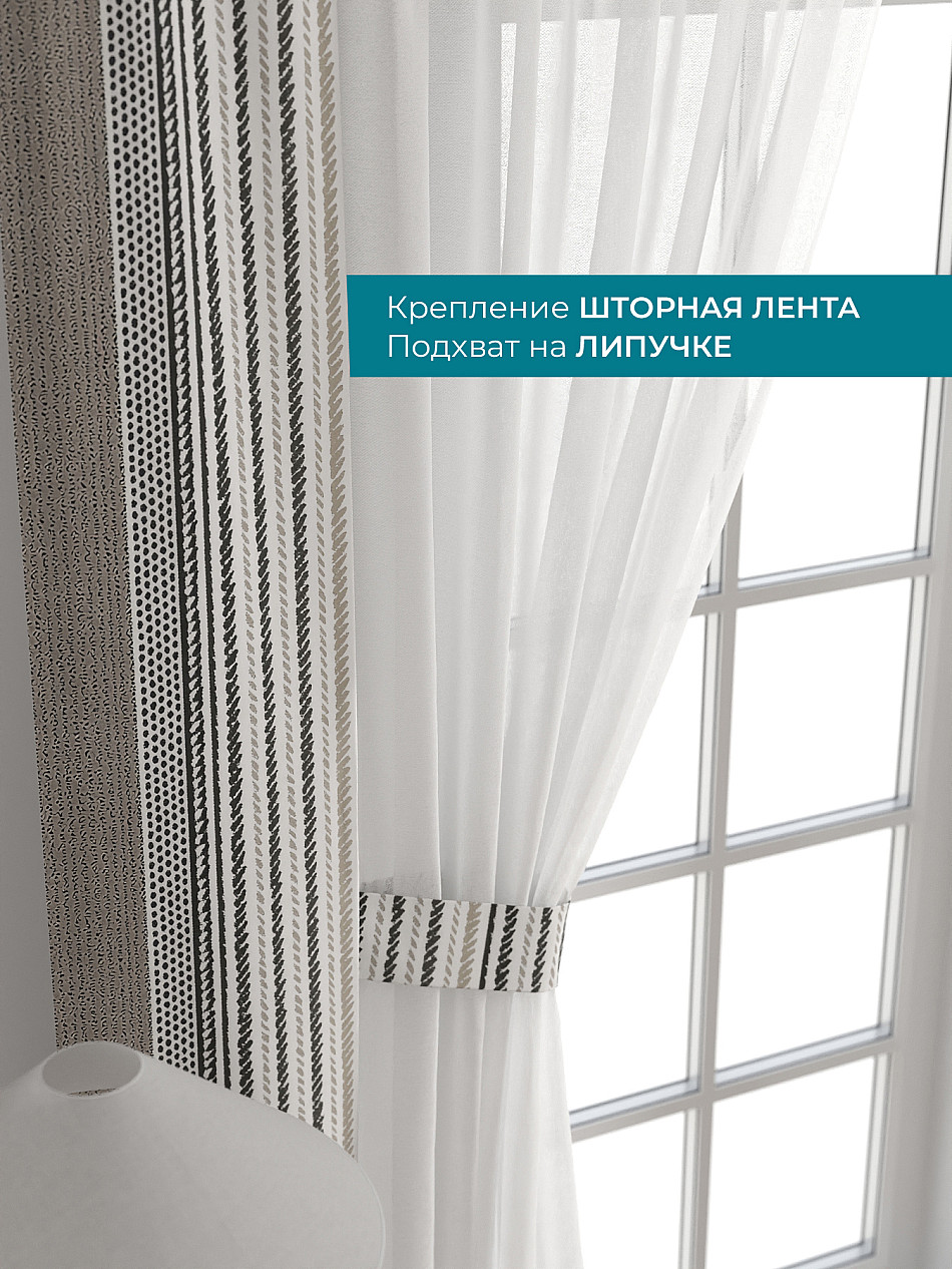 Декоративные подхваты 38х260 см — 2 шт.; Тюль 150х260 см — 2 шт. ( Изменить высоту) Крепление: шторная лента (крючки), кулиска Подробнее
