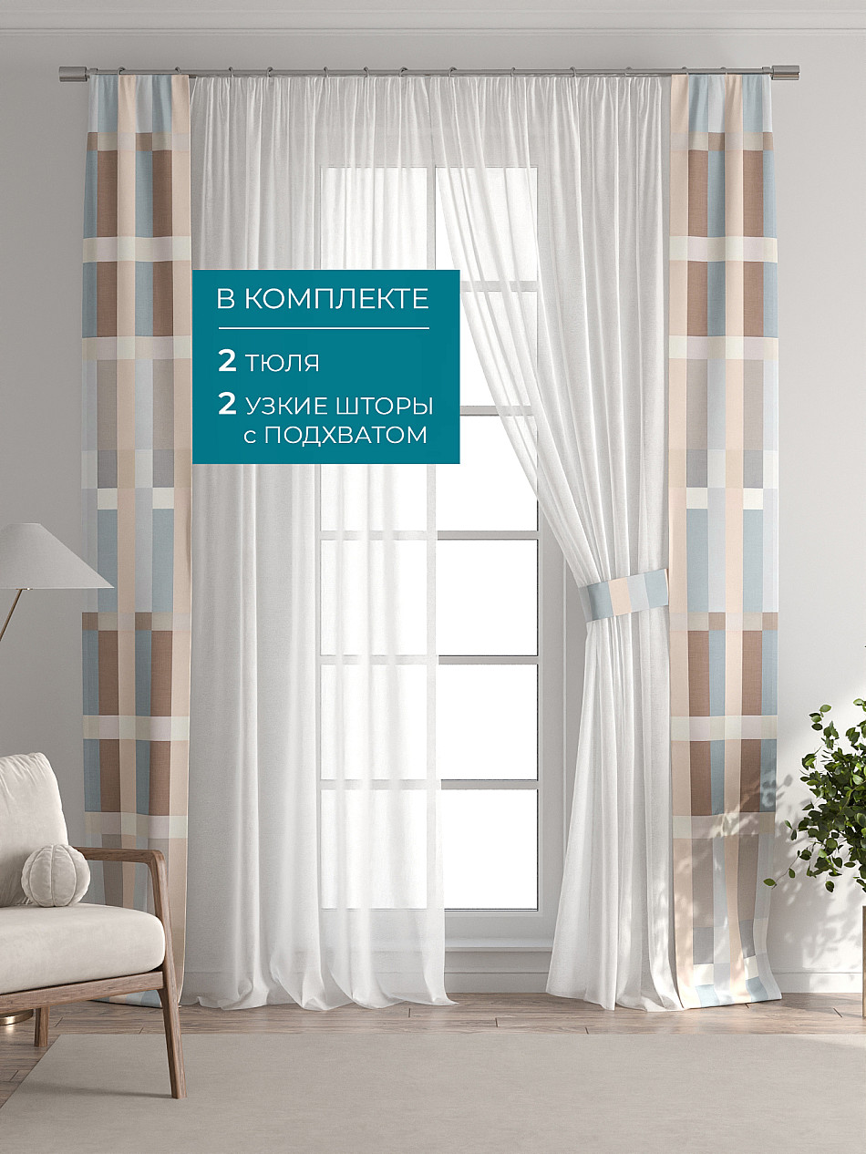 В комплект входят: - 2 полотна белого тюля шириной 150 см.. и высотой 260 см и - 2 узкие шторы шириной всего 38 см. и длиной 260 см., которые навешиваются рядом с тюлем не утяжеляя вид окна и не препятствуя попаданию солнечного света в комнату. При этом выполняют роль подхватов и добавляют акцент в интерьер.
