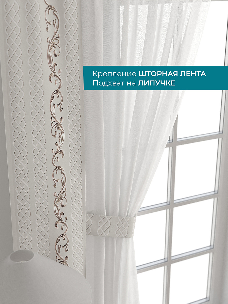 Декоративные подхваты 38х260 см — 2 шт.; Тюль 150х260 см — 2 шт. ( Изменить высоту) Крепление: шторная лента (крючки), кулиска Подробнее