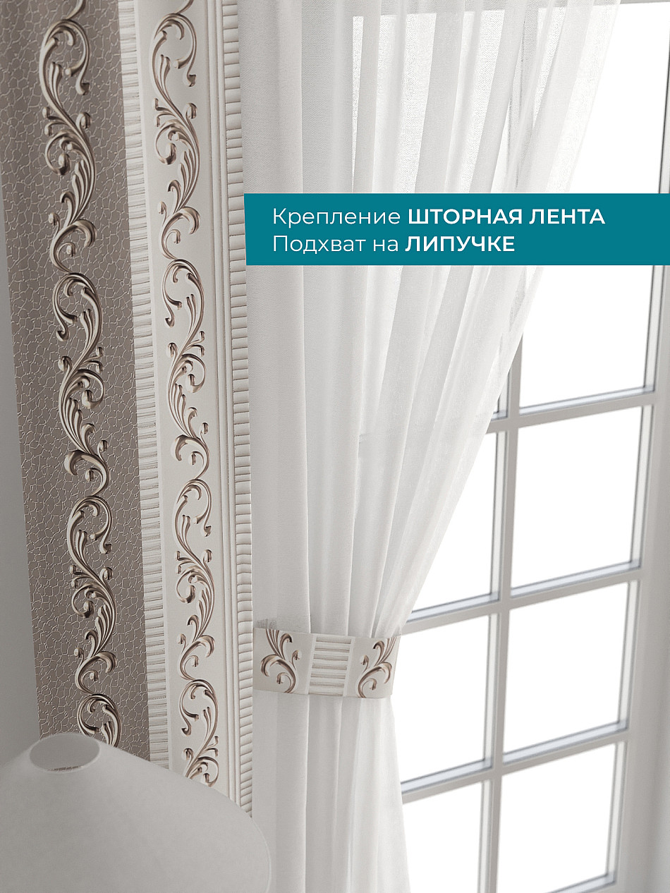 Декоративные подхваты 38х260 см — 2 шт.; Тюль 150х260 см — 2 шт. ( Изменить высоту) Крепление: шторная лента (крючки), кулиска Подробнее