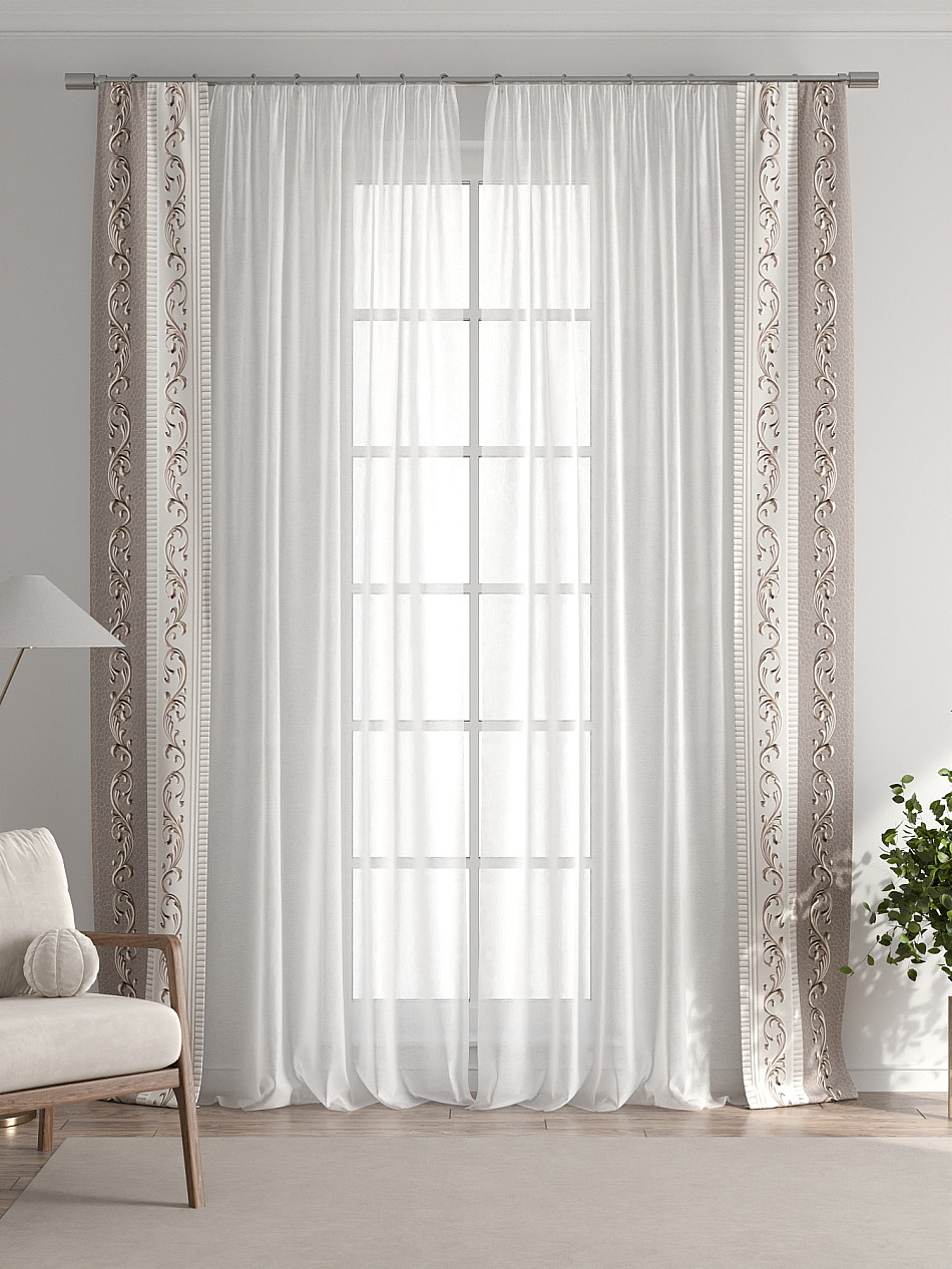 В комплект входят: - 2 полотна белого тюля шириной 150 см.. и высотой 260 см и - 2 узкие шторы шириной всего 38 см. и длиной 260 см., которые навешиваются рядом с тюлем не утяжеляя вид окна и не препятствуя попаданию солнечного света в комнату. При этом выполняют роль подхватов и добавляют акцент в интерьер.