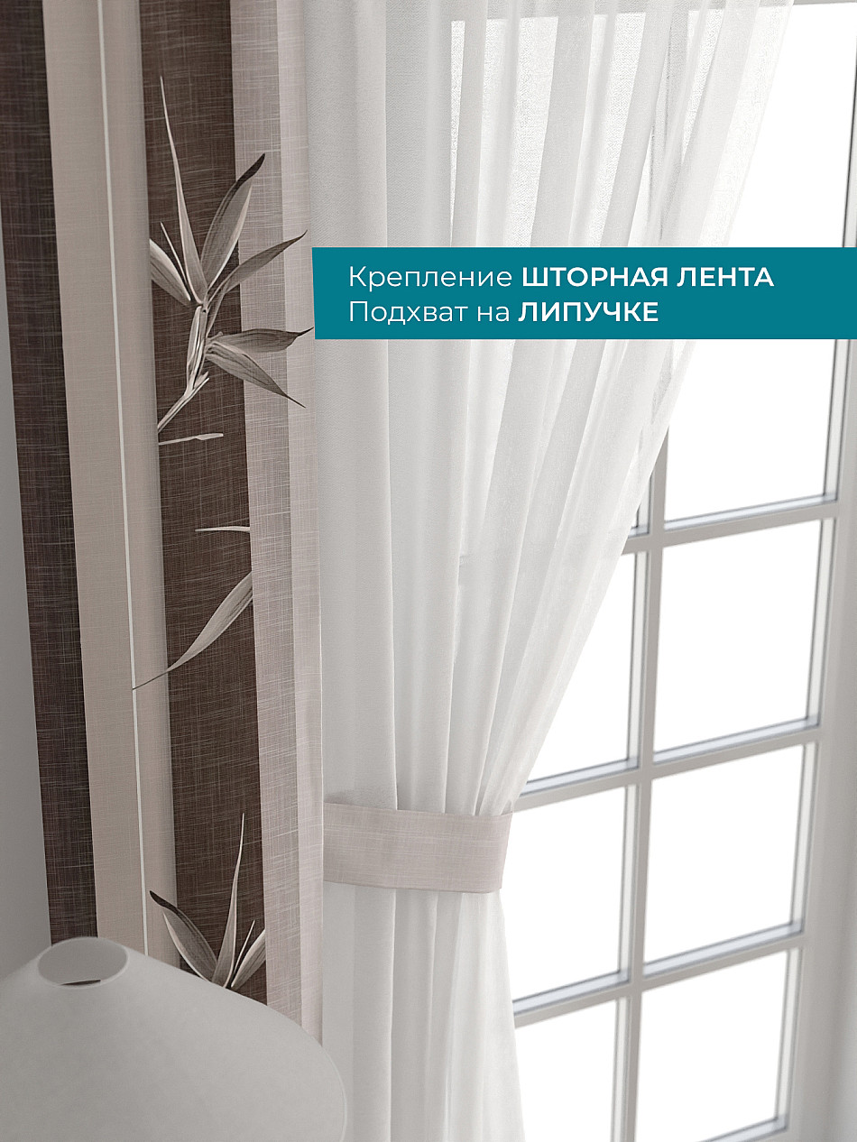 Декоративные подхваты 38х260 см — 2 шт.; Тюль 150х260 см — 2 шт. ( Изменить высоту) Крепление: шторная лента (крючки), кулиска Подробнее