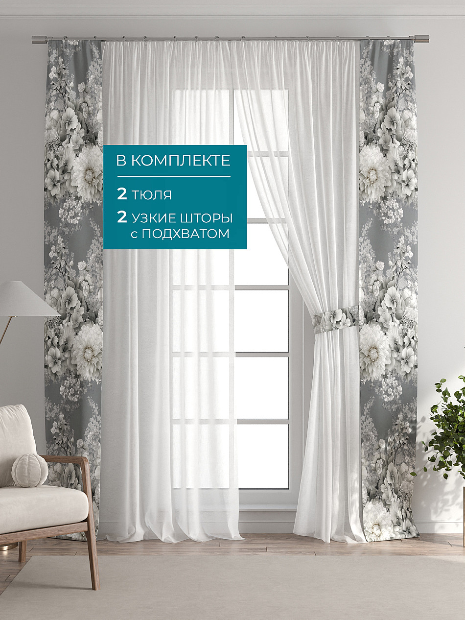 В комплект входят: - 2 полотна белого тюля шириной 150 см.. и высотой 260 см и - 2 узкие шторы шириной всего 38 см. и длиной 260 см., которые навешиваются рядом с тюлем не утяжеляя вид окна и не препятствуя попаданию солнечного света в комнату. При этом выполняют роль подхватов и добавляют акцент в интерьер.