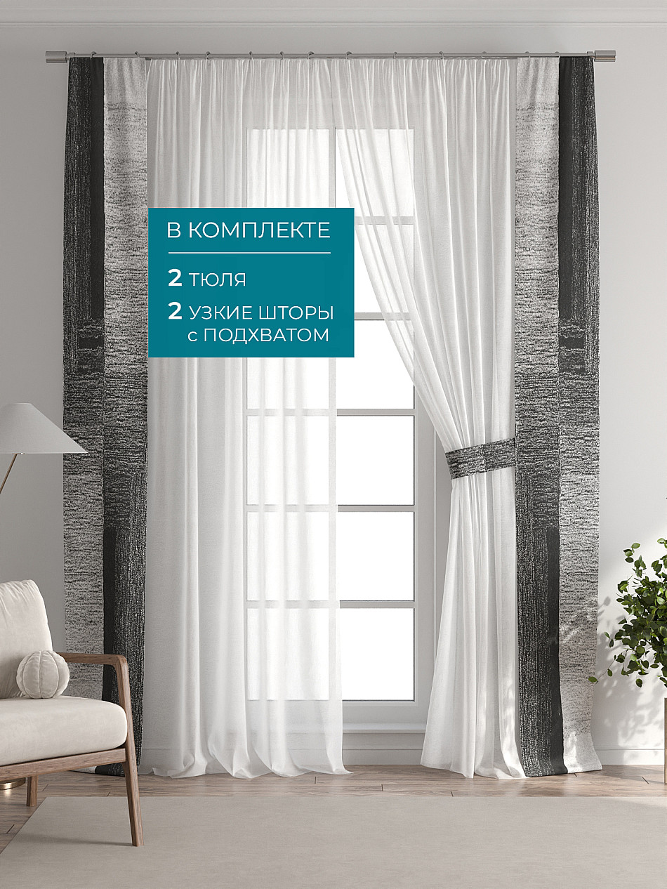 В комплект входят: - 2 полотна белого тюля шириной 150 см.. и высотой 260 см и - 2 узкие шторы шириной всего 38 см. и длиной 260 см., которые навешиваются рядом с тюлем не утяжеляя вид окна и не препятствуя попаданию солнечного света в комнату. При этом выполняют роль подхватов и добавляют акцент в интерьер.