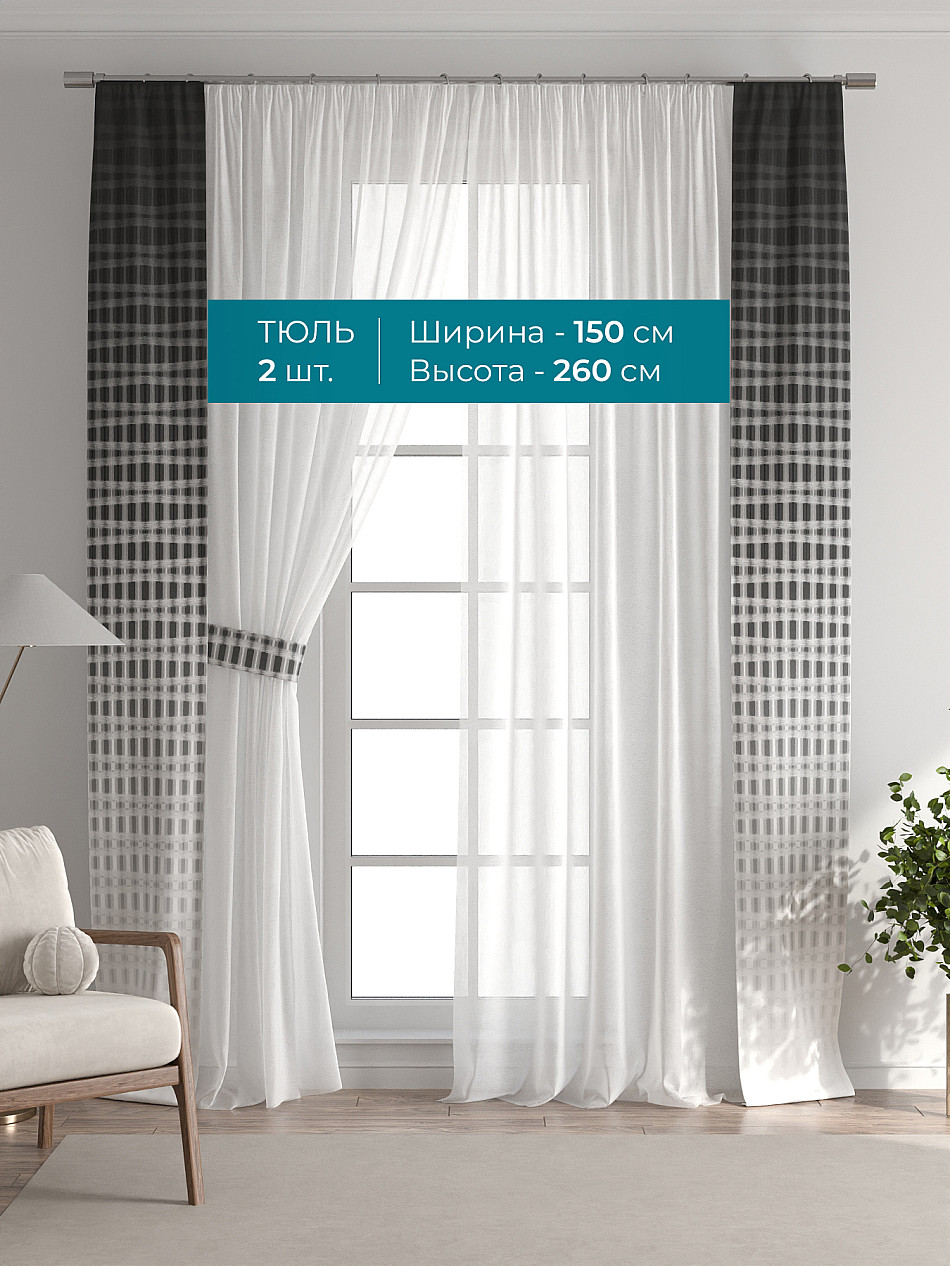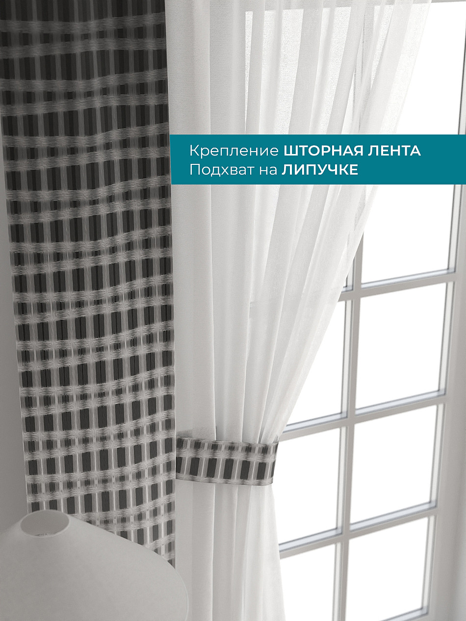Декоративные подхваты 38х260 см — 2 шт.; Тюль 150х260 см — 2 шт. ( Изменить высоту) Крепление: шторная лента (крючки), кулиска Подробнее