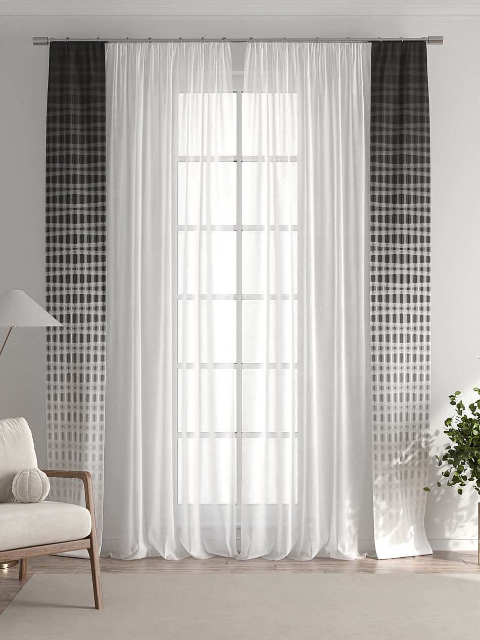 Представляем вам абсолютно новый подход к оформлению окна! Наш комплект белого тюля с узкими цветными шторами-подхватами станет идеальным решением для тех, кто любит, чтобы в комнате было светло и при этом хочет добавить цветовой акцент в интерьер комнаты.