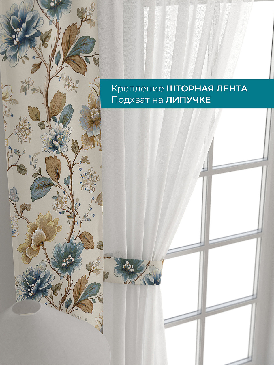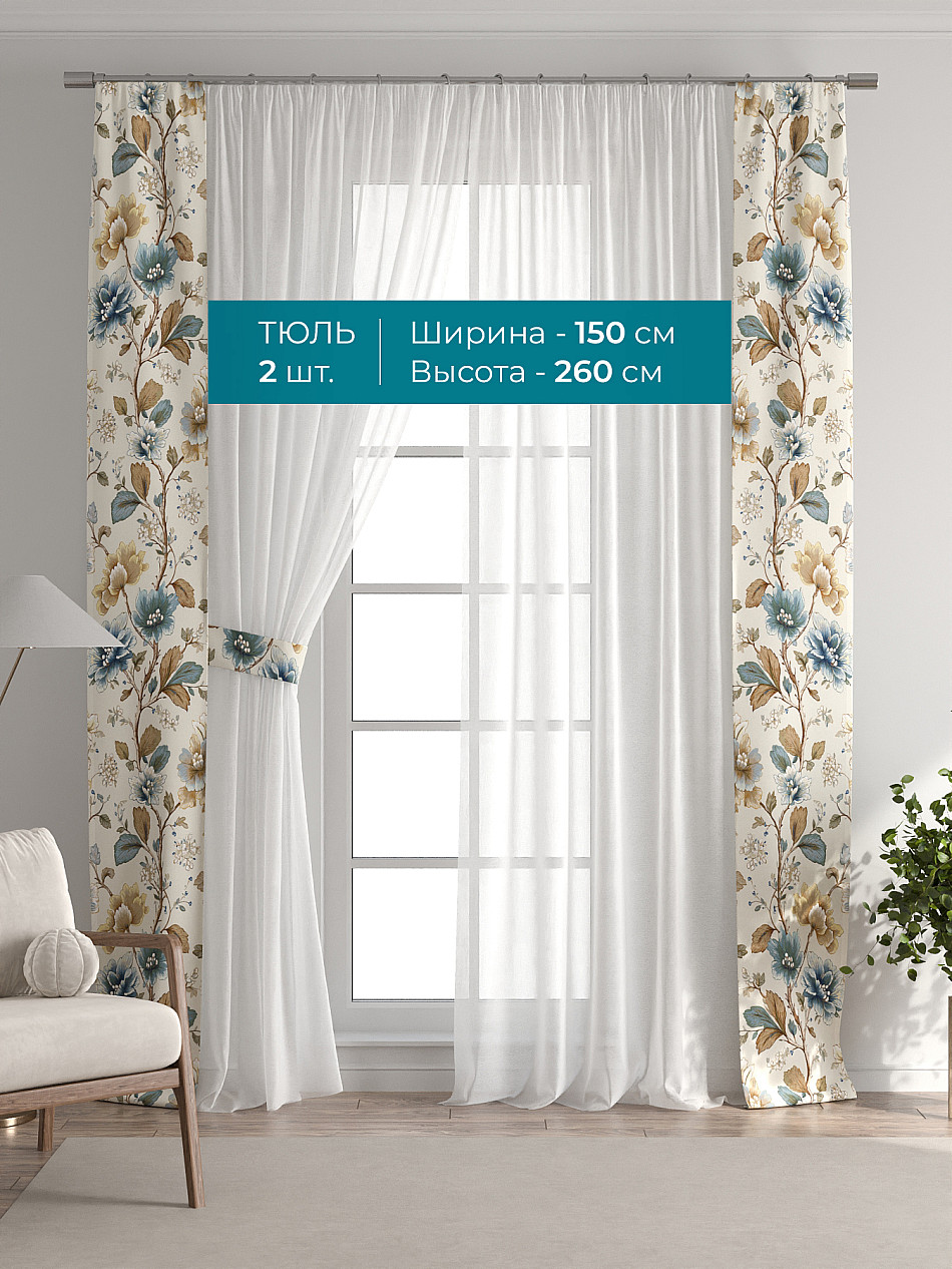 Декоративные подхваты 38х260 см — 2 шт.; Тюль 150х260 см — 2 шт. ( Изменить высоту) Крепление: шторная лента (крючки), кулиска Подробнее