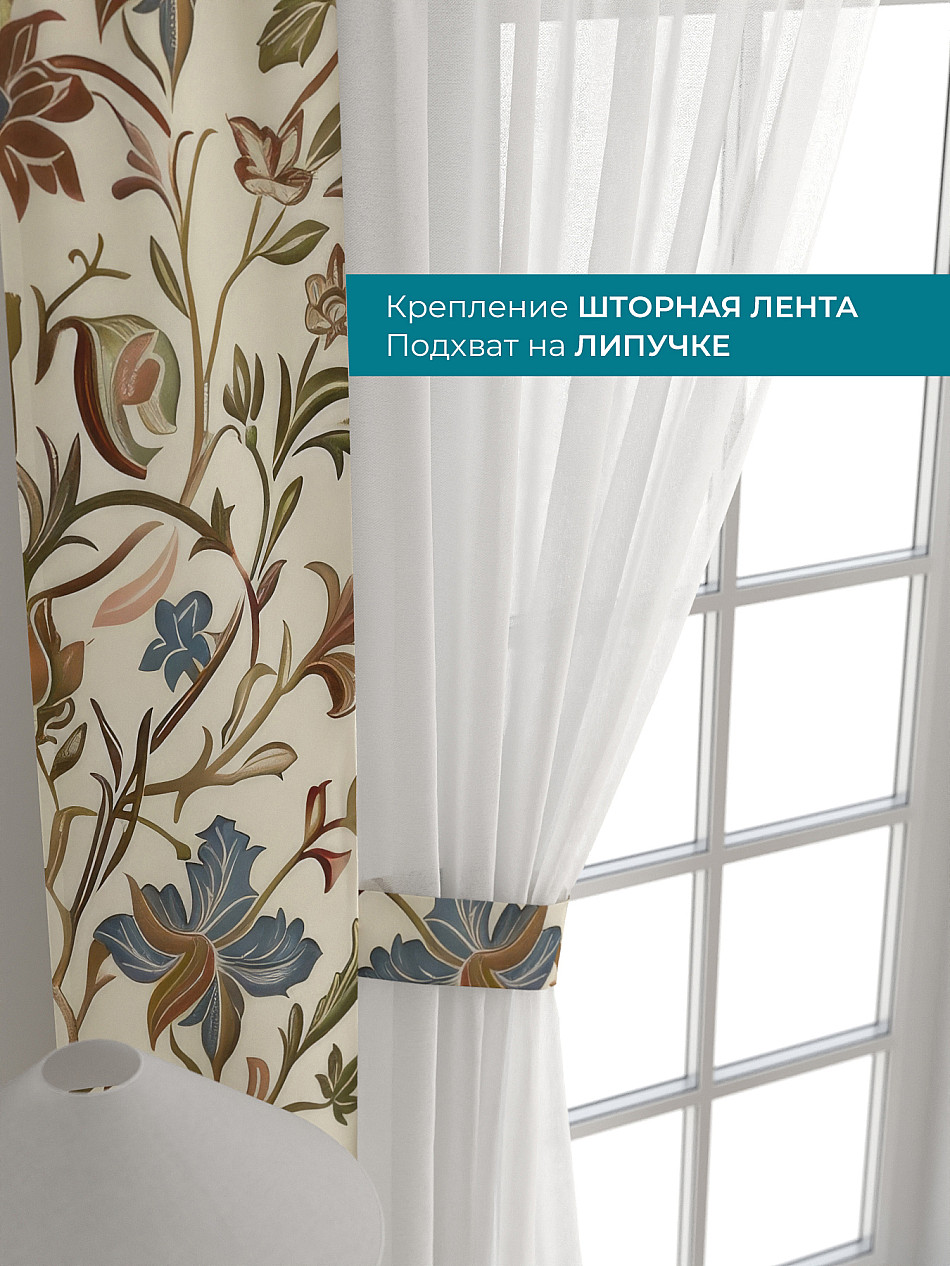 Декоративные подхваты 38х260 см — 2 шт.; Тюль 150х260 см — 2 шт. ( Изменить высоту) Крепление: шторная лента (крючки), кулиска Подробнее