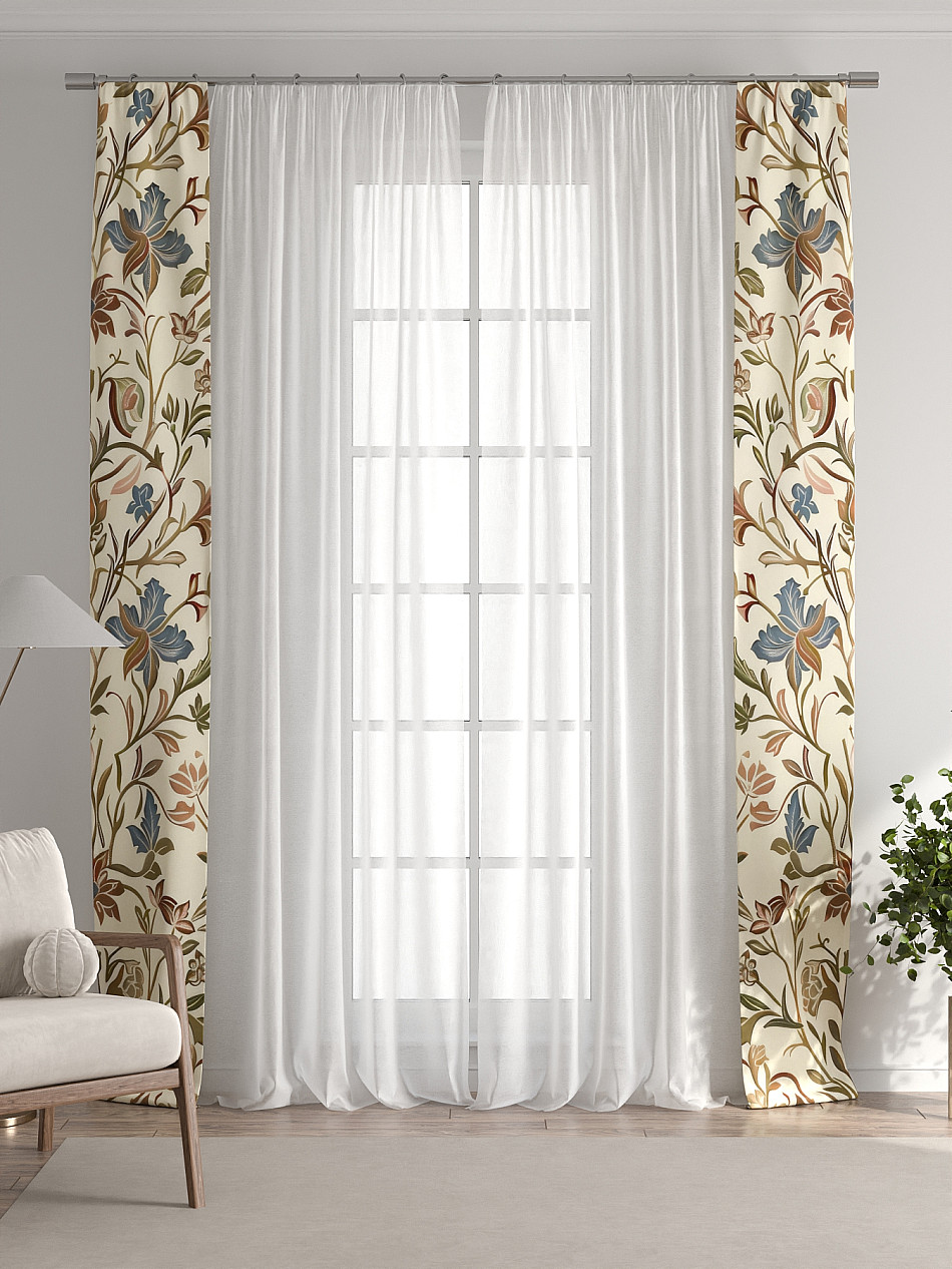 Комплект готов к развешиванию. По верхнему краю пристрочена шторная лента 6 см, с 2-мя рядами петель под крючки, что позволяет регулировать высоту. Одновременно имеется кулиска (карман для штанги), в которую можно продеть карниз любого диаметра.