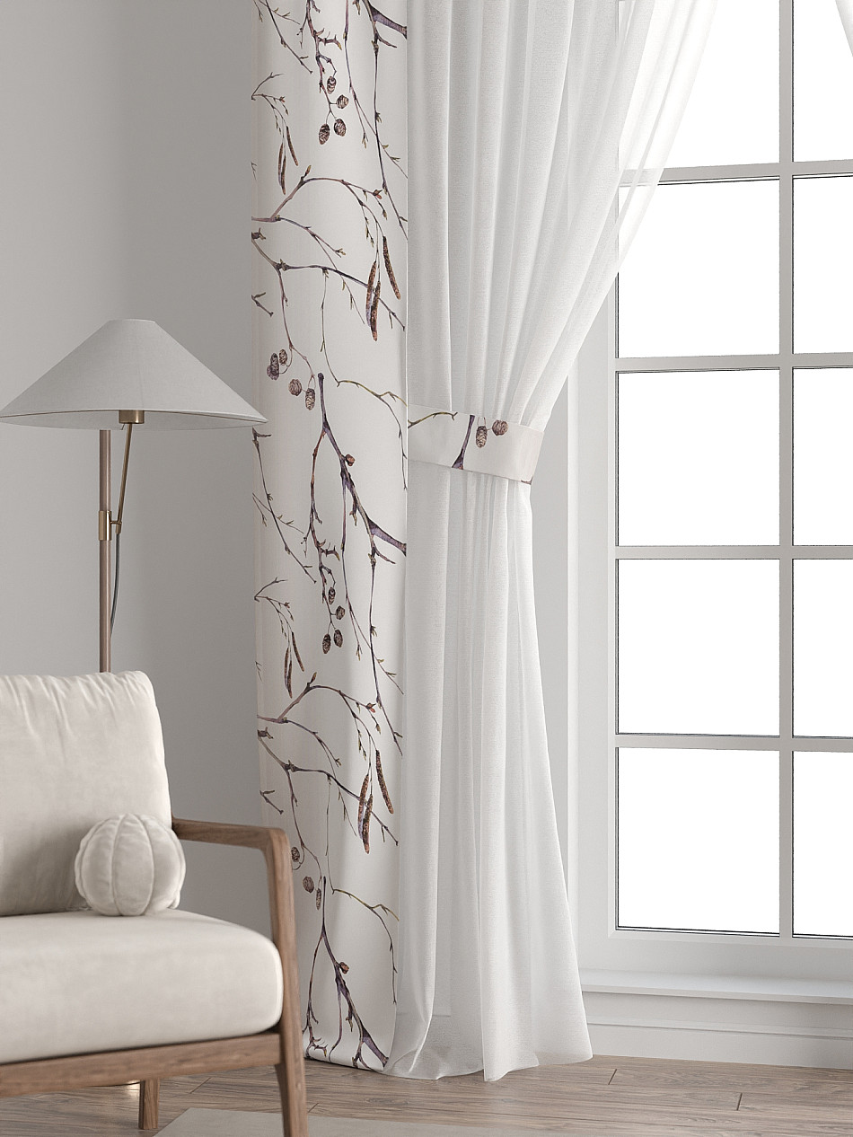В комплект входят: - 2 полотна белого тюля шириной 150 см.. и высотой 260 см и - 2 узкие шторы шириной всего 38 см. и длиной 260 см., которые навешиваются рядом с тюлем не утяжеляя вид окна и не препятствуя попаданию солнечного света в комнату. При этом выполняют роль подхватов и добавляют акцент в интерьер.