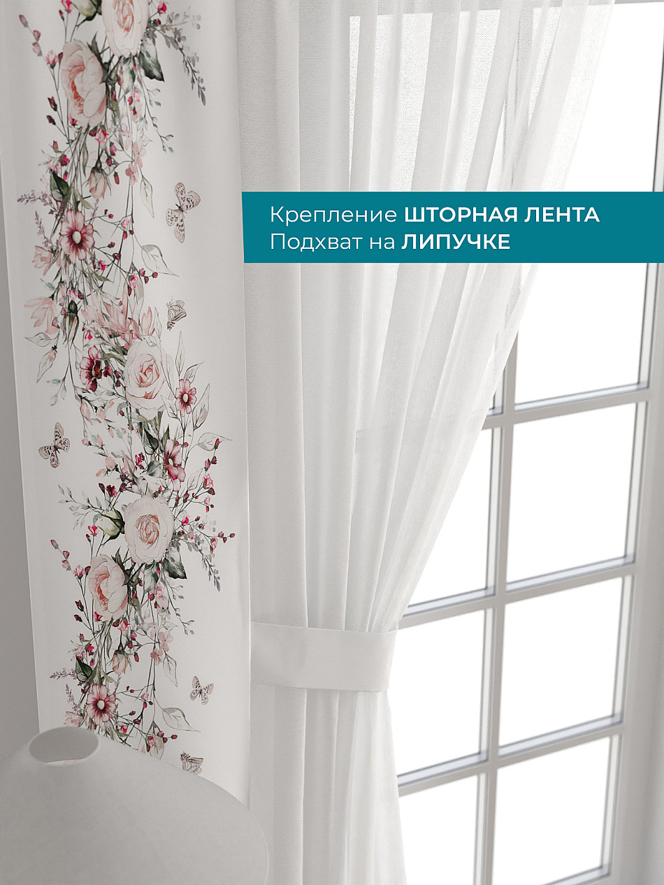 На высоте 125 см. пришит подхват (ширина 10 см.), который позволяет легко зафиксировать тюль или шторы в нужном положении при помощи липучки.