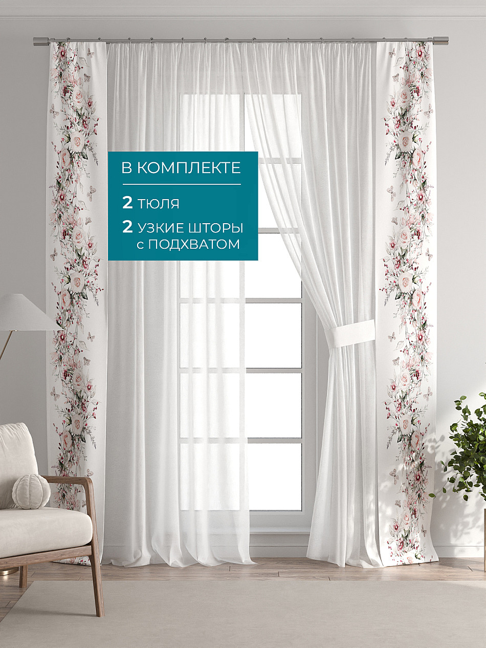 В комплект входят: - 2 полотна белого тюля шириной 150 см.. и высотой 260 см и - 2 узкие шторы шириной всего 38 см. и длиной 260 см., которые навешиваются рядом с тюлем не утяжеляя вид окна и не препятствуя попаданию солнечного света в комнату. При этом выполняют роль подхватов и добавляют акцент в интерьер.