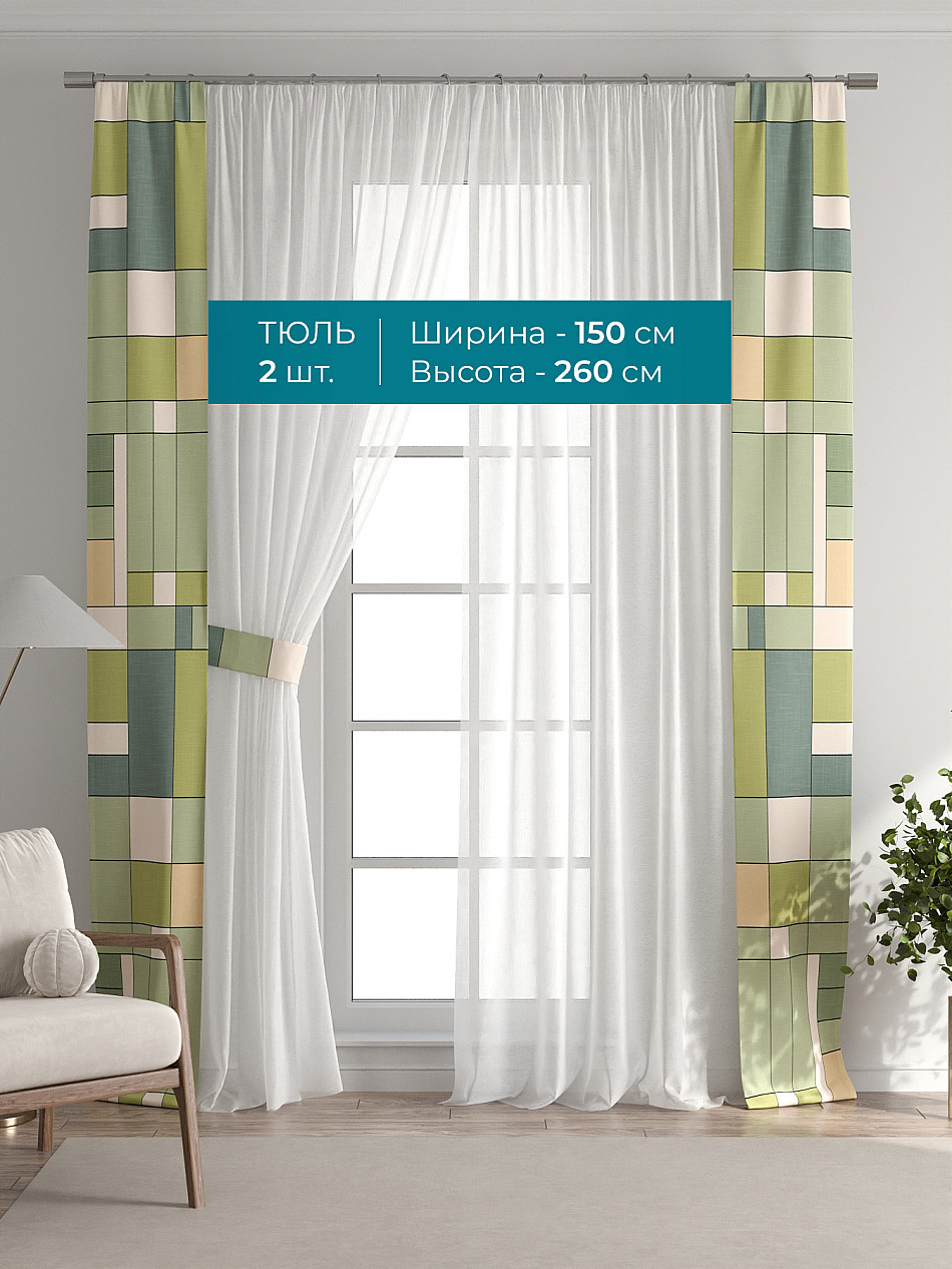 Декоративные подхваты 38х260 см — 2 шт.; Тюль 150х260 см — 2 шт. ( Изменить высоту) Крепление: шторная лента (крючки), кулиска Подробнее