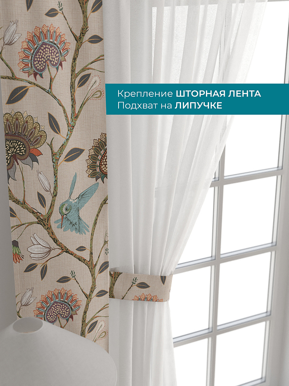 Декоративные подхваты 38х260 см — 2 шт.; Тюль 150х260 см — 2 шт. ( Изменить высоту) Крепление: шторная лента (крючки), кулиска Подробнее