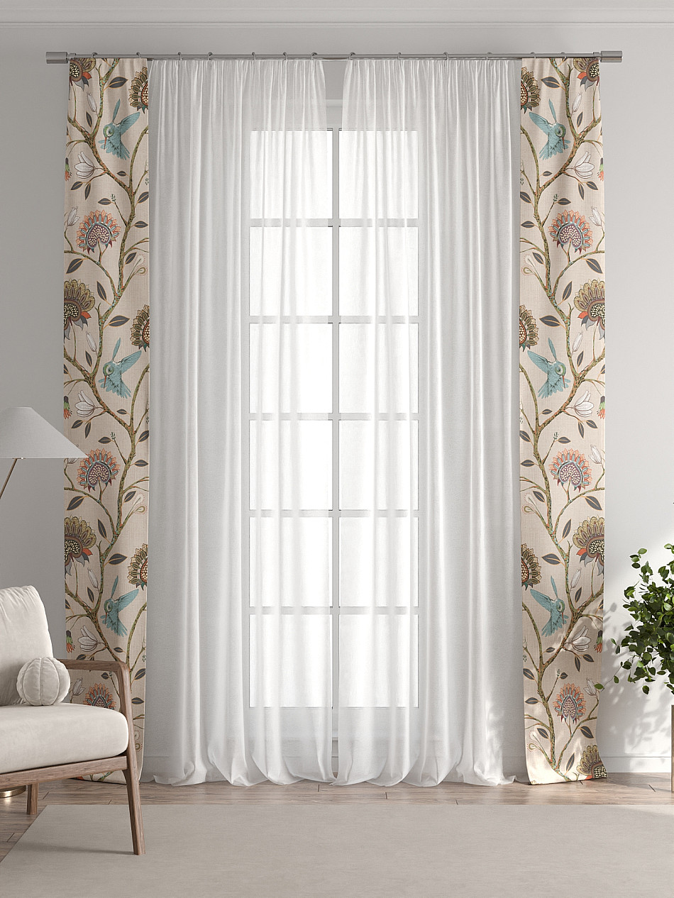 Комплект готов к развешиванию. По верхнему краю пристрочена шторная лента 6 см, с 2-мя рядами петель под крючки, что позволяет регулировать высоту. Одновременно имеется кулиска (карман для штанги), в которую можно продеть карниз любого диаметра.