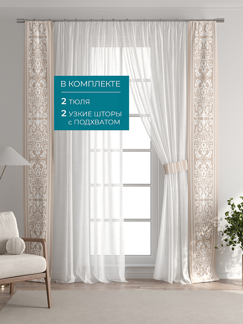 В комплект входят: - 2 полотна белого тюля шириной 150 см.. и высотой 260 см и - 2 узкие шторы шириной всего 38 см. и длиной 260 см., которые навешиваются рядом с тюлем не утяжеляя вид окна и не препятствуя попаданию солнечного света в комнату. При этом выполняют роль подхватов и добавляют акцент в интерьер.