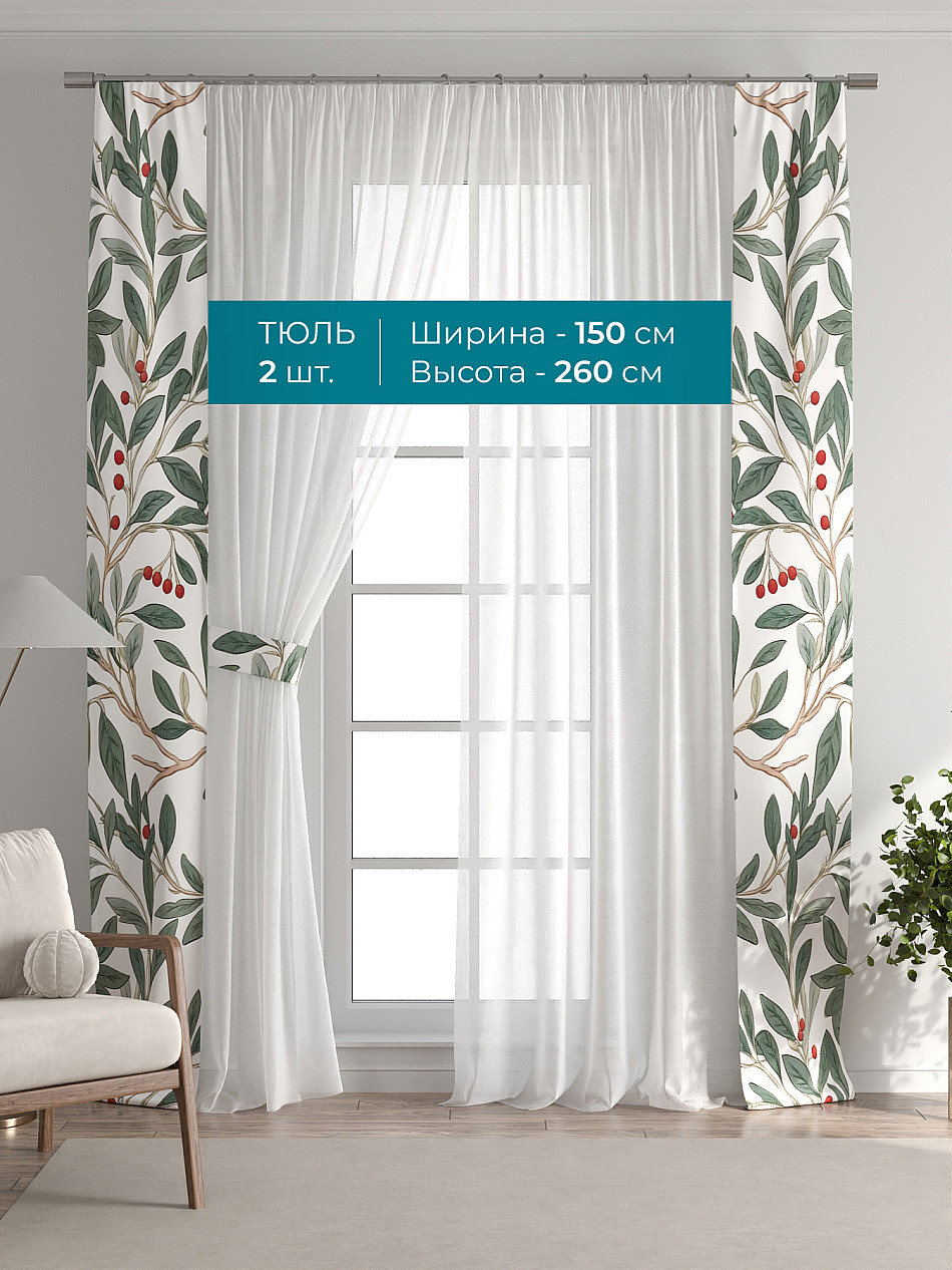 Декоративные подхваты 38х260 см — 2 шт.; Тюль 150х260 см — 2 шт. ( Изменить высоту) Крепление: шторная лента (крючки), кулиска Подробнее