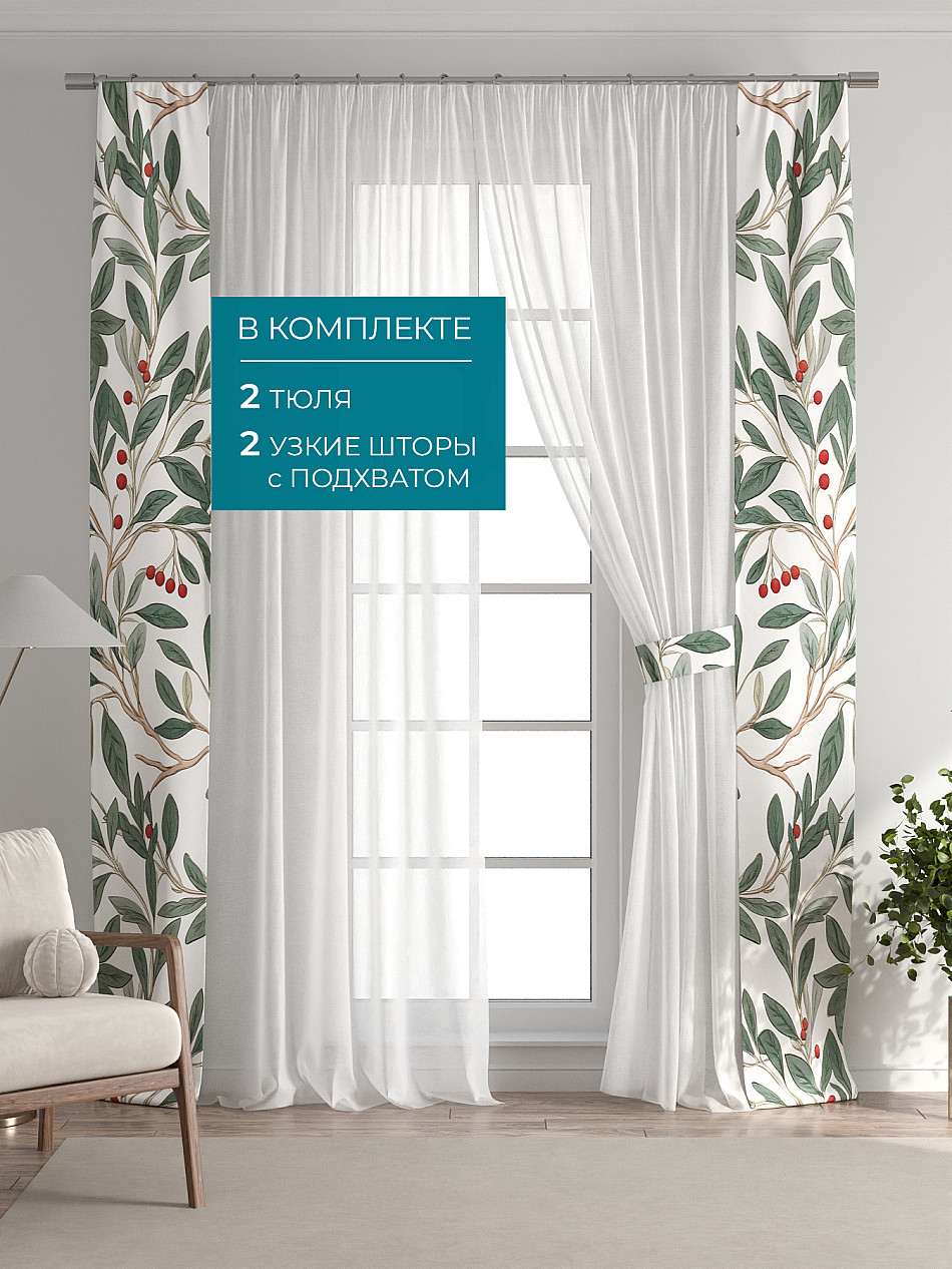 В комплект входят: - 2 полотна белого тюля шириной 150 см.. и высотой 260 см и - 2 узкие шторы шириной всего 38 см. и длиной 260 см., которые навешиваются рядом с тюлем не утяжеляя вид окна и не препятствуя попаданию солнечного света в комнату. При этом выполняют роль подхватов и добавляют акцент в интерьер.