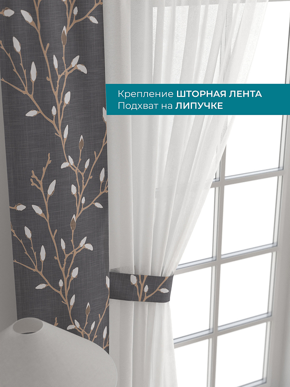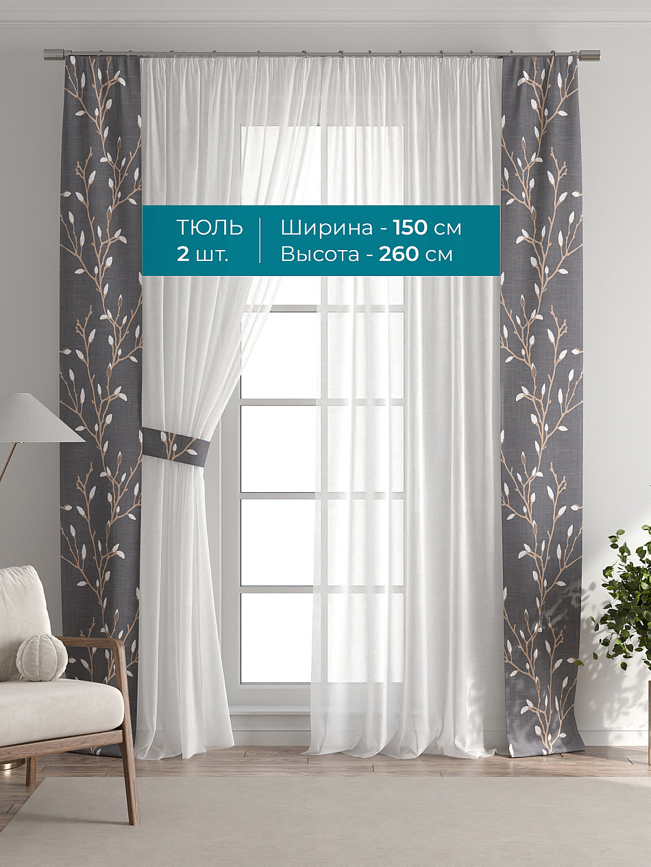 Декоративные подхваты 38х260 см — 2 шт.; Тюль 150х260 см — 2 шт. ( Изменить высоту) Крепление: шторная лента (крючки), кулиска Подробнее