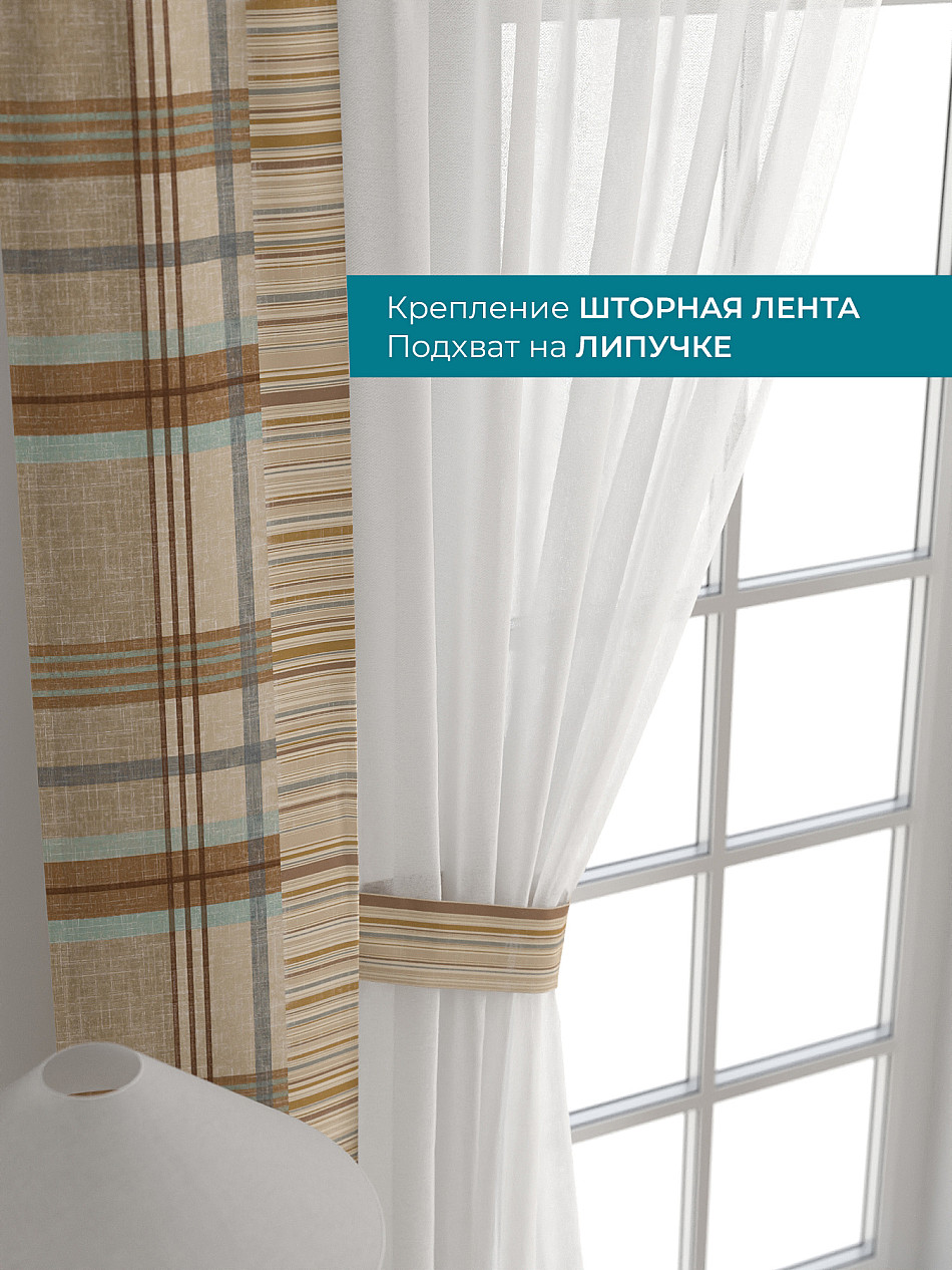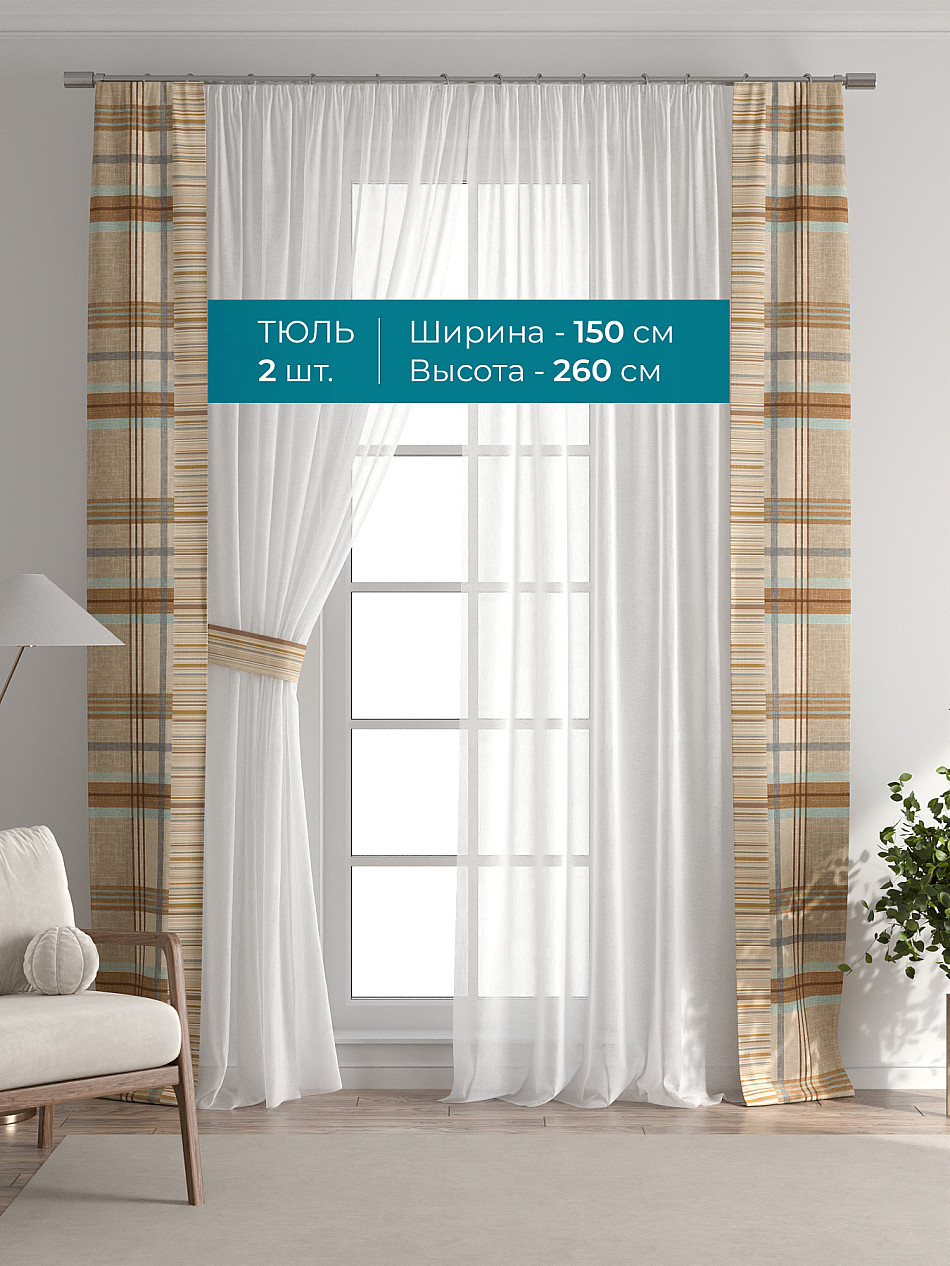 Декоративные подхваты 38х260 см — 2 шт.; Тюль 150х260 см — 2 шт. ( Изменить высоту) Крепление: шторная лента (крючки), кулиска Подробнее