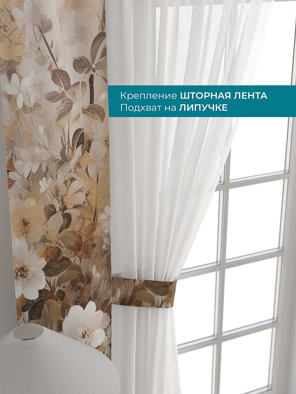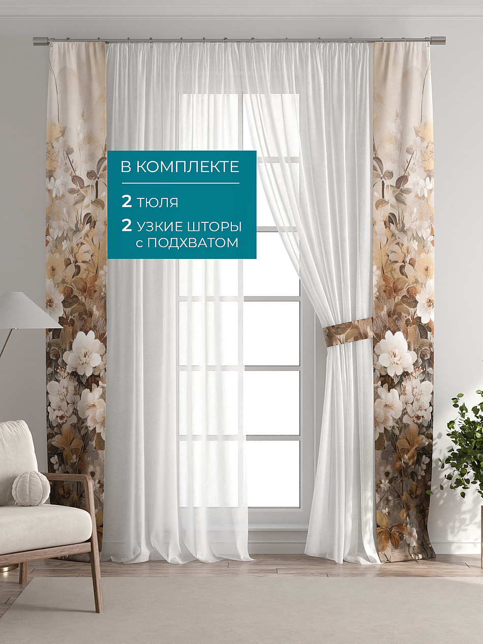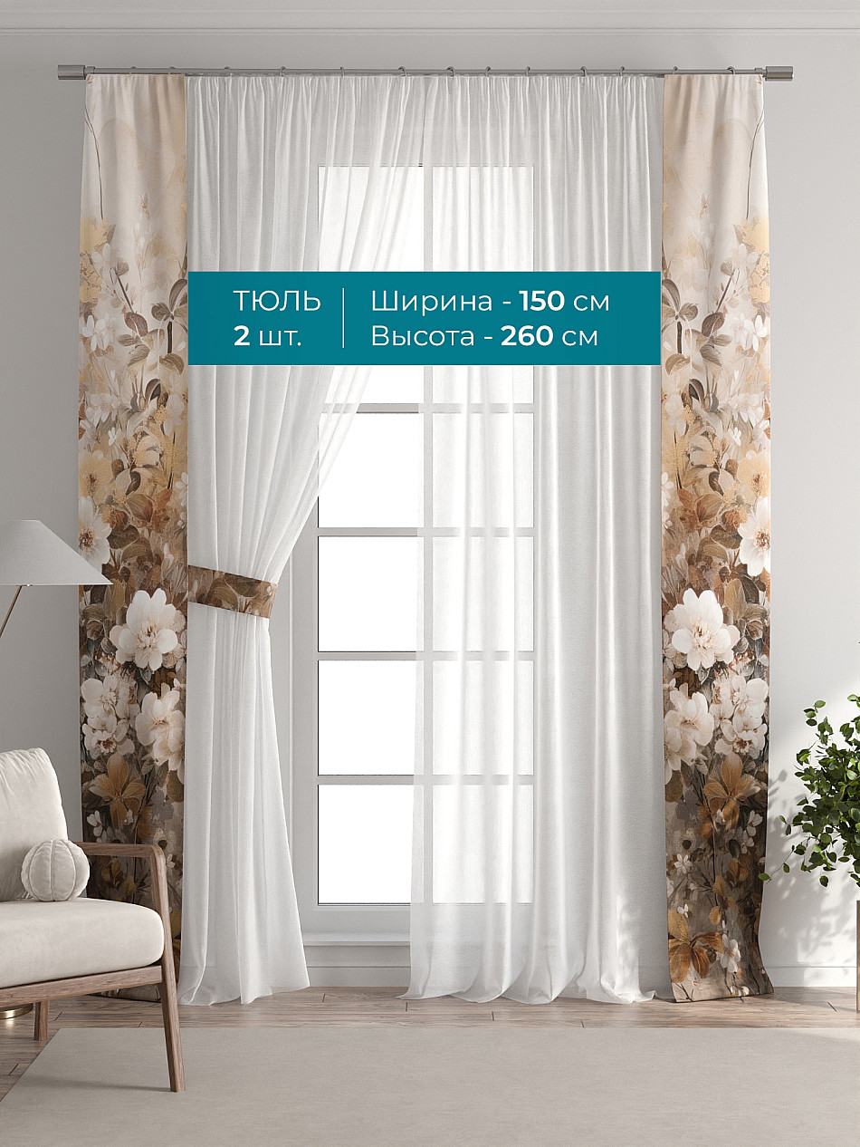 Декоративные подхваты 38х260 см — 2 шт.; Тюль 150х260 см — 2 шт. ( Изменить высоту) Крепление: шторная лента (крючки), кулиска Подробнее