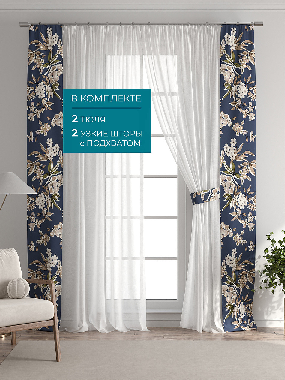 В комплект входят: - 2 полотна белого тюля шириной 150 см.. и высотой 260 см и - 2 узкие шторы шириной всего 38 см. и длиной 260 см., которые навешиваются рядом с тюлем не утяжеляя вид окна и не препятствуя попаданию солнечного света в комнату. При этом выполняют роль подхватов и добавляют акцент в интерьер.