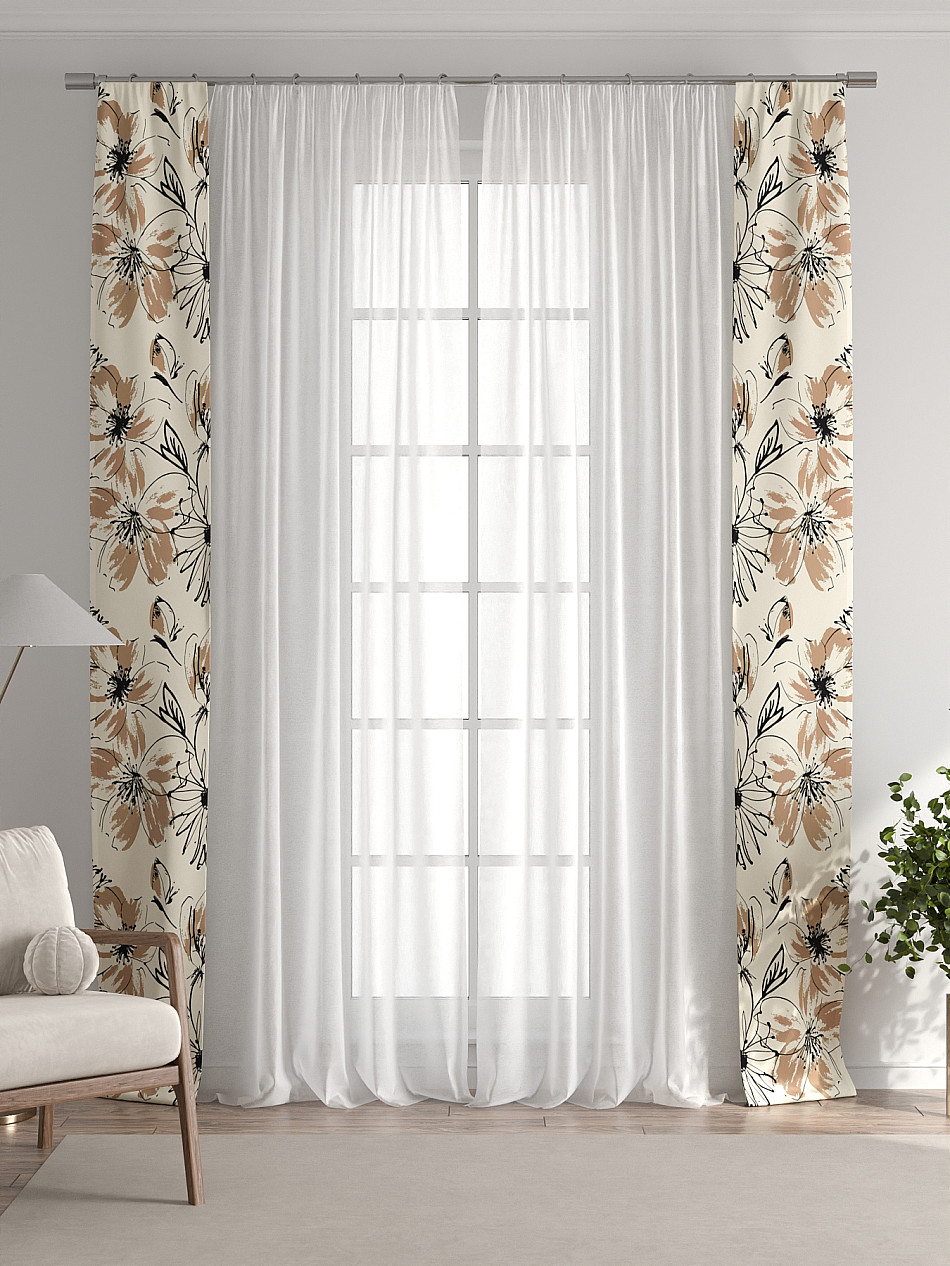 Комплект готов к развешиванию. По верхнему краю пристрочена шторная лента 6 см, с 2-мя рядами петель под крючки, что позволяет регулировать высоту. Одновременно имеется кулиска (карман для штанги), в которую можно продеть карниз любого диаметра.