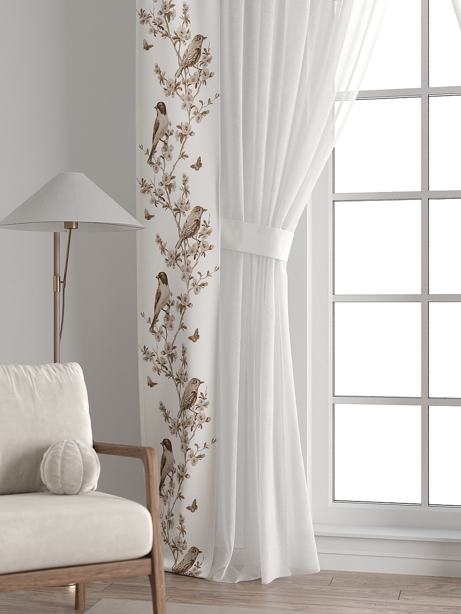 Комплект готов к развешиванию. По верхнему краю пристрочена шторная лента 6 см, с 2-мя рядами петель под крючки, что позволяет регулировать высоту. Одновременно имеется кулиска (карман для штанги), в которую можно продеть карниз любого диаметра.