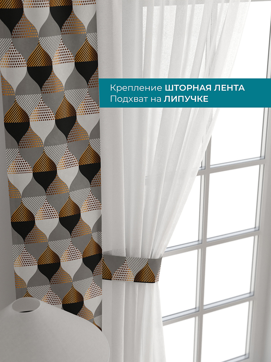 Декоративные подхваты 38х260 см — 2 шт.; Тюль 150х260 см — 2 шт. ( Изменить высоту) Крепление: шторная лента (крючки), кулиска Подробнее