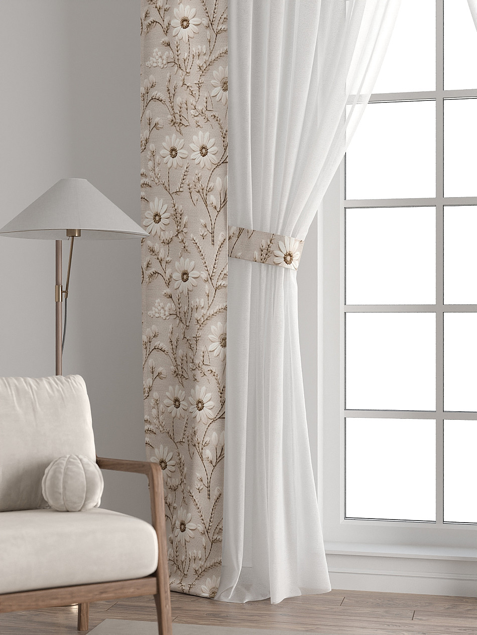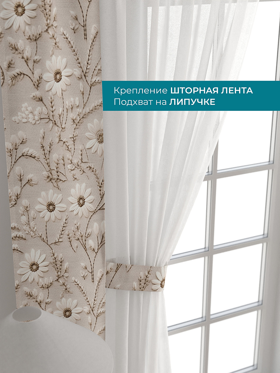 На высоте 125 см. пришит подхват (ширина 10 см.), который позволяет легко зафиксировать тюль или шторы в нужном положении при помощи липучки.