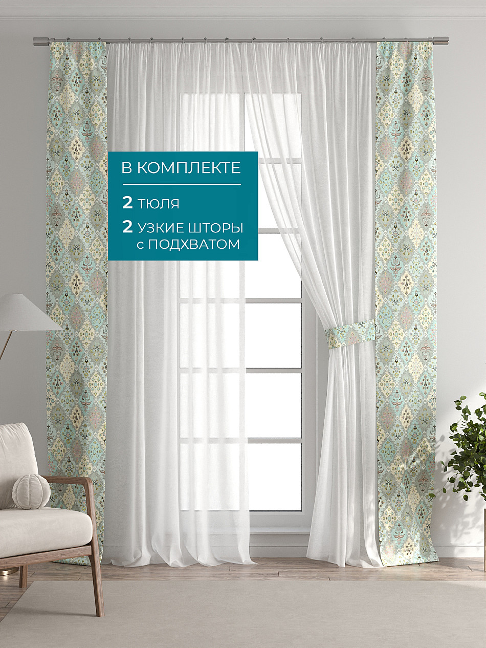 В комплект входят: - 2 полотна белого тюля шириной 150 см.. и высотой 260 см и - 2 узкие шторы шириной всего 38 см. и длиной 260 см., которые навешиваются рядом с тюлем не утяжеляя вид окна и не препятствуя попаданию солнечного света в комнату. При этом выполняют роль подхватов и добавляют акцент в интерьер.