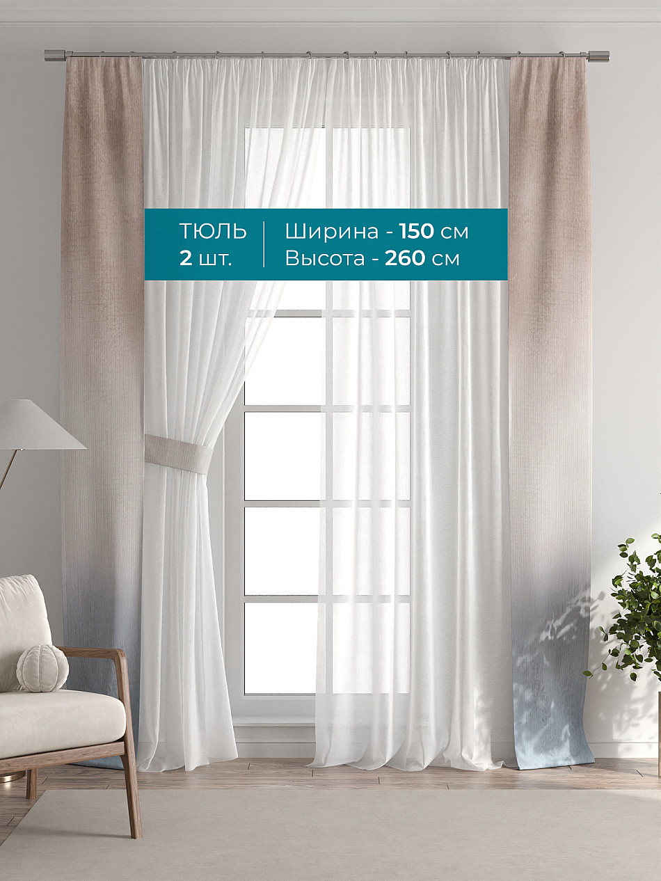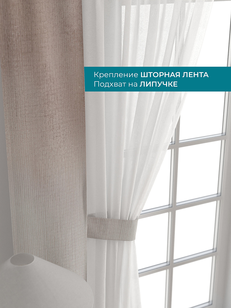 Декоративные подхваты 38х260 см — 2 шт.; Тюль 150х260 см — 2 шт. ( Изменить высоту) Крепление: шторная лента (крючки), кулиска Подробнее