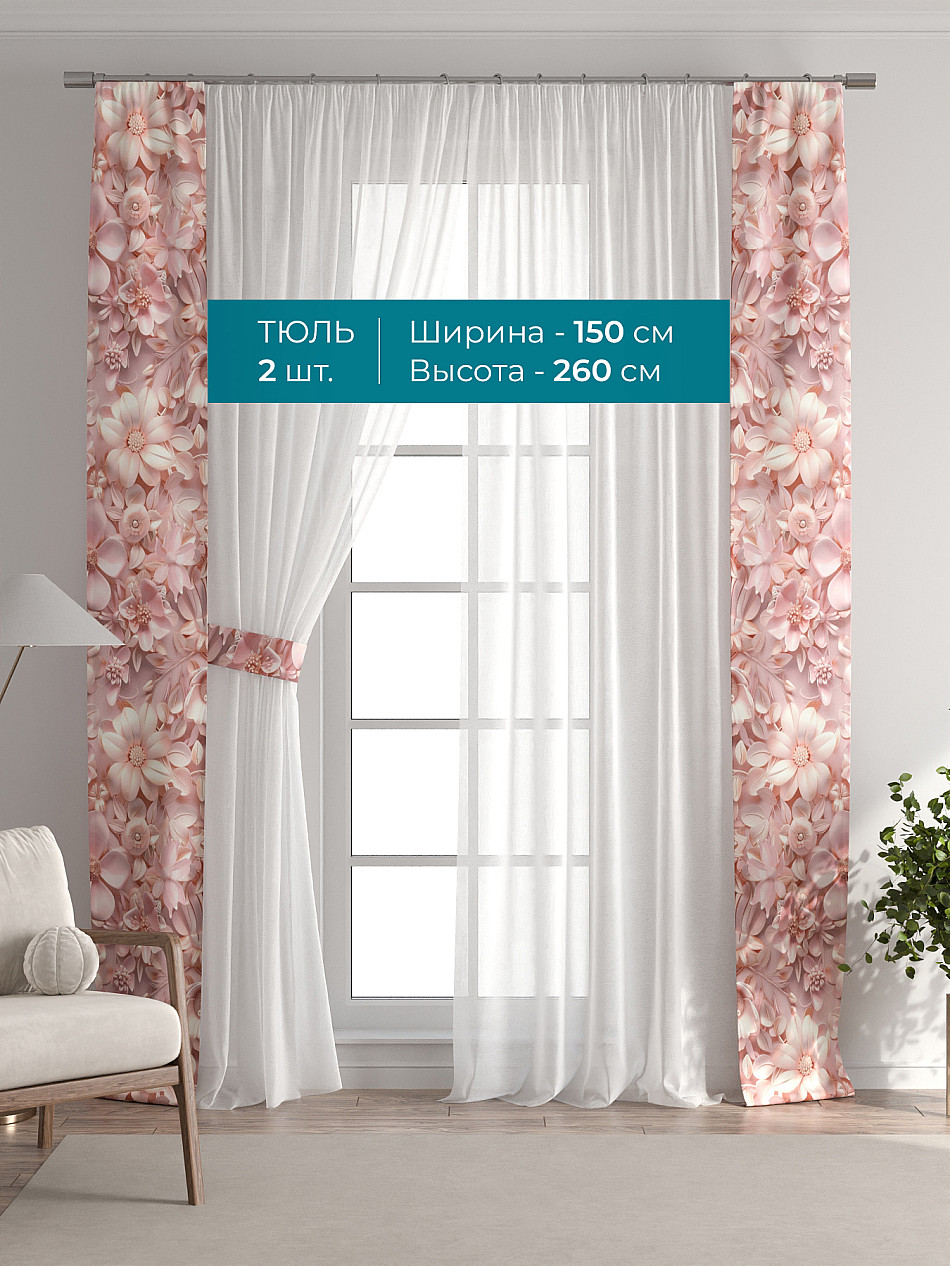 Декоративные подхваты 38х260 см — 2 шт.; Тюль 150х260 см — 2 шт. ( Изменить высоту) Крепление: шторная лента (крючки), кулиска Подробнее