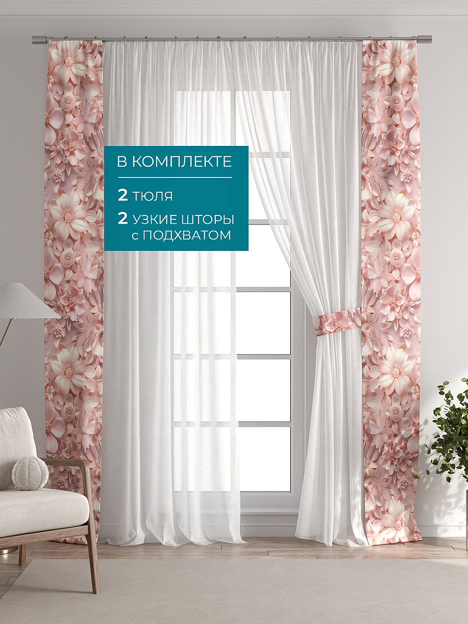 В комплект входят: - 2 полотна белого тюля шириной 150 см.. и высотой 260 см и - 2 узкие шторы шириной всего 38 см. и длиной 260 см., которые навешиваются рядом с тюлем не утяжеляя вид окна и не препятствуя попаданию солнечного света в комнату. При этом выполняют роль подхватов и добавляют акцент в интерьер.
