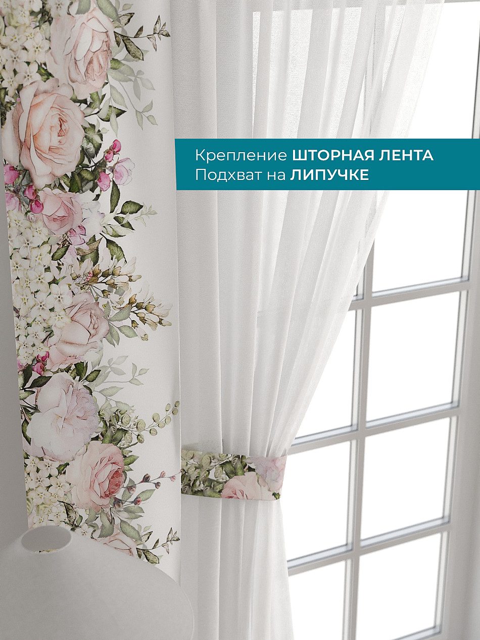 На высоте 125 см. пришит подхват (ширина 10 см.), который позволяет легко зафиксировать тюль или шторы в нужном положении при помощи липучки.