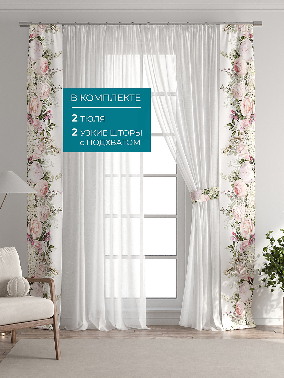 В комплект входят: - 2 полотна белого тюля шириной 150 см.. и высотой 260 см и - 2 узкие шторы шириной всего 38 см. и длиной 260 см., которые навешиваются рядом с тюлем не утяжеляя вид окна и не препятствуя попаданию солнечного света в комнату. При этом выполняют роль подхватов и добавляют акцент в интерьер.