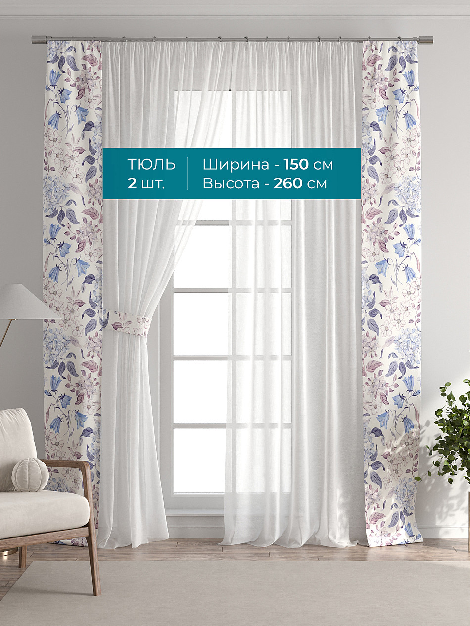 Декоративные подхваты 38х260 см — 2 шт.; Тюль 150х260 см — 2 шт. ( Изменить высоту) Крепление: шторная лента (крючки), кулиска Подробнее