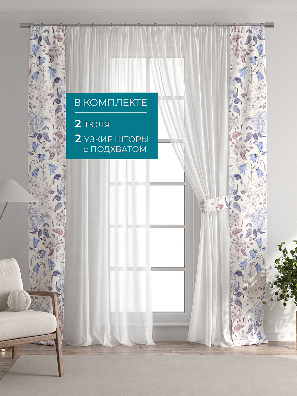 В комплект входят: - 2 полотна белого тюля шириной 150 см.. и высотой 260 см и - 2 узкие шторы шириной всего 38 см. и длиной 260 см., которые навешиваются рядом с тюлем не утяжеляя вид окна и не препятствуя попаданию солнечного света в комнату. При этом выполняют роль подхватов и добавляют акцент в интерьер.
