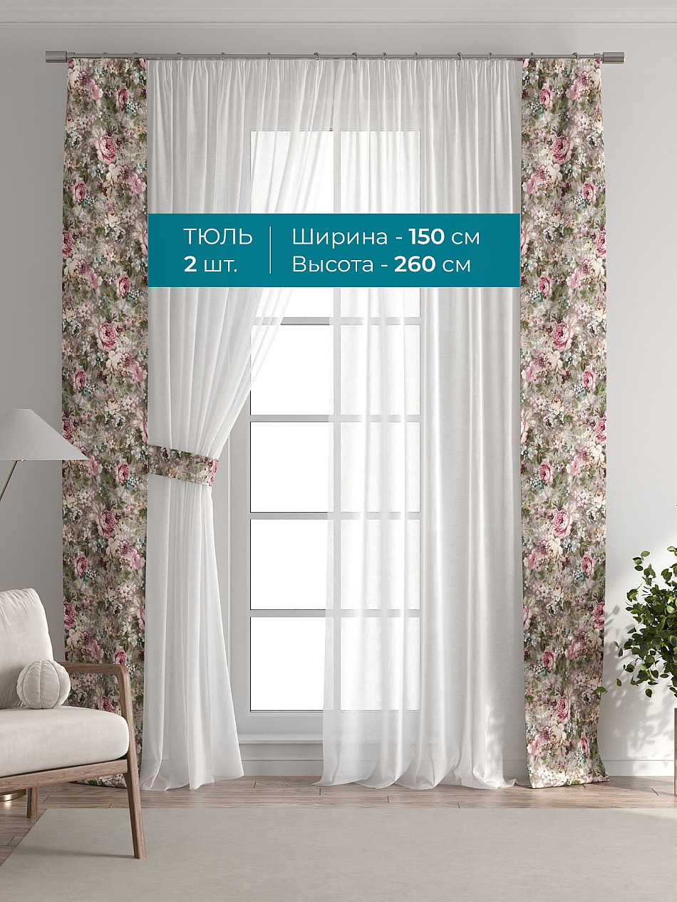 Декоративные подхваты 38х260 см — 2 шт.; Тюль 150х260 см — 2 шт. ( Изменить высоту) Крепление: шторная лента (крючки), кулиска Подробнее