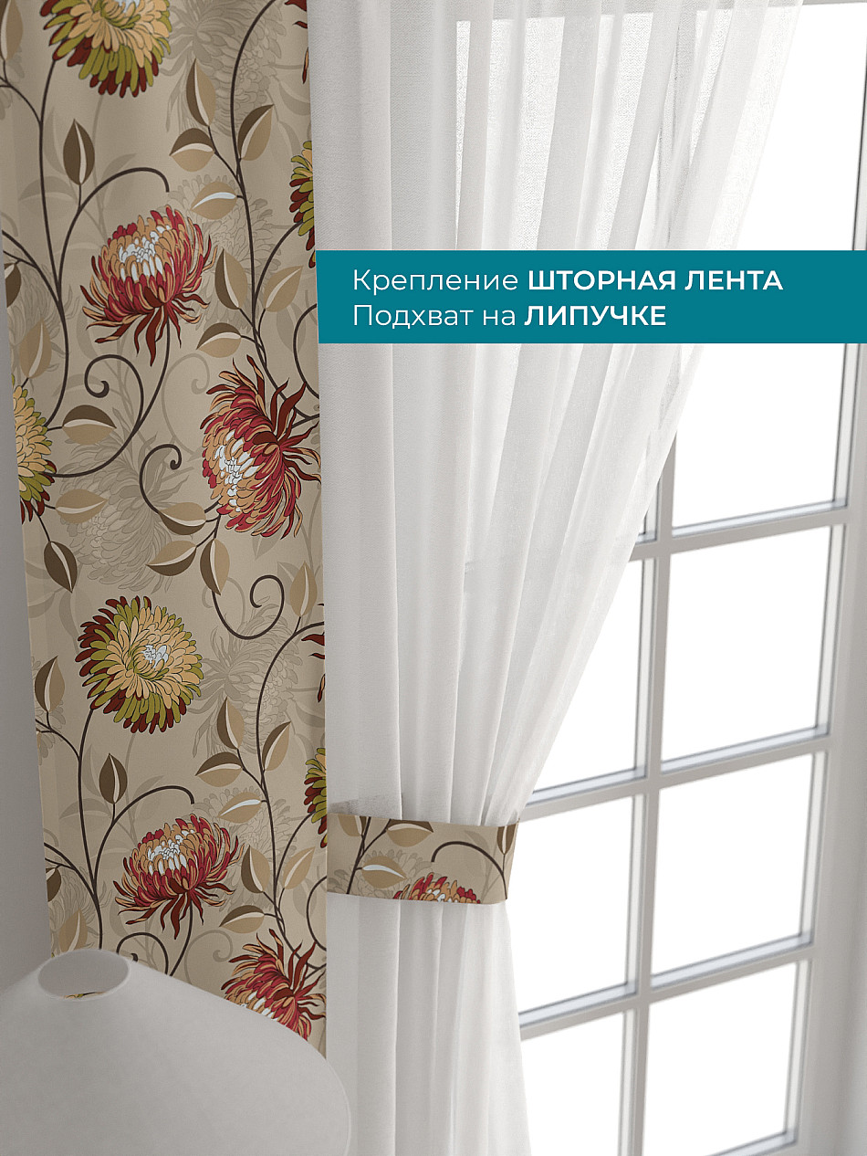 Декоративные подхваты 38х260 см — 2 шт.; Тюль 150х260 см — 2 шт. ( Изменить высоту) Крепление: шторная лента (крючки), кулиска Подробнее