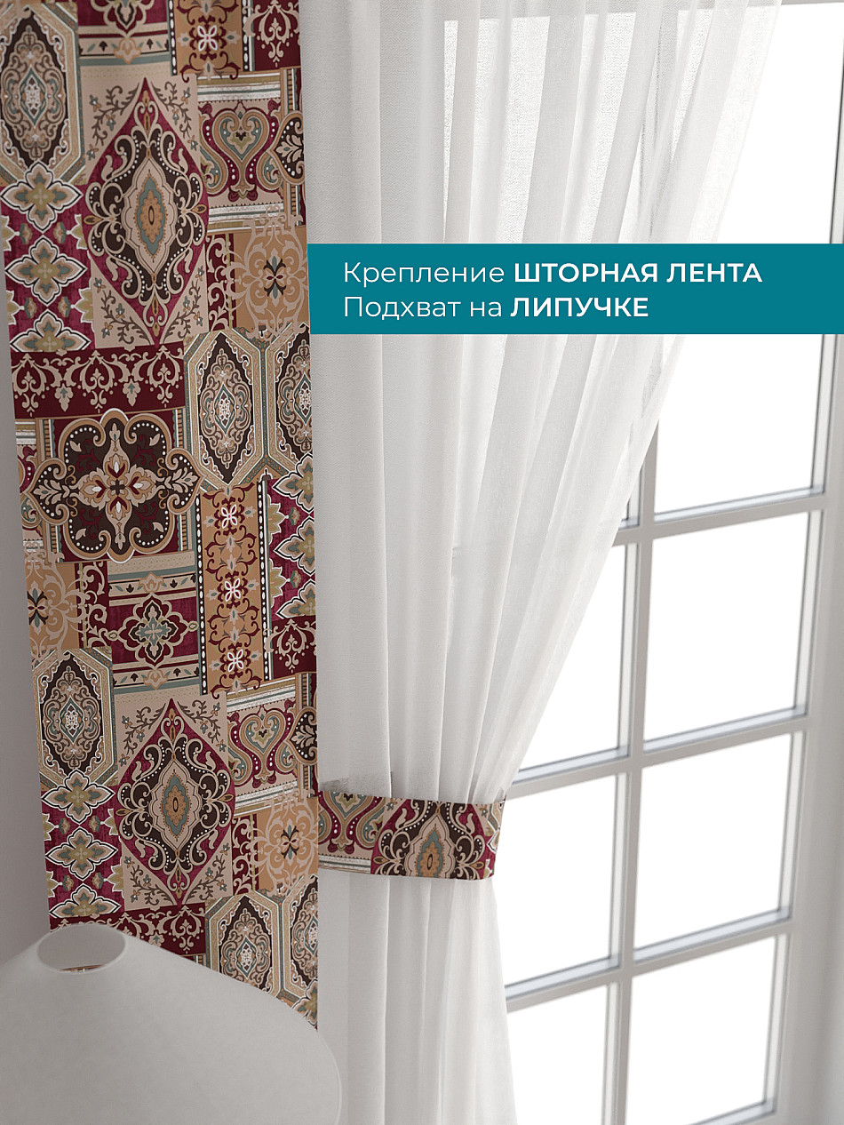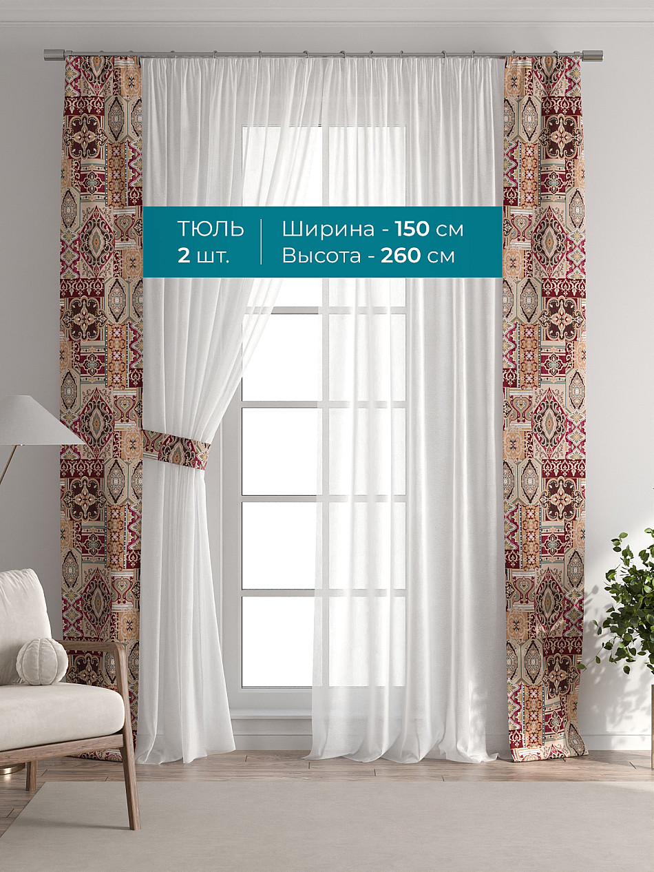Декоративные подхваты 38х260 см — 2 шт.; Тюль 150х260 см — 2 шт. ( Изменить высоту) Крепление: шторная лента (крючки), кулиска Подробнее