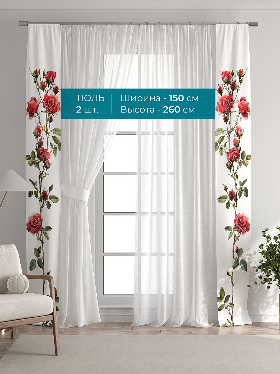 Декоративные подхваты 38х260 см — 2 шт.; Тюль 150х260 см — 2 шт. ( Изменить высоту) Крепление: шторная лента (крючки), кулиска Подробнее