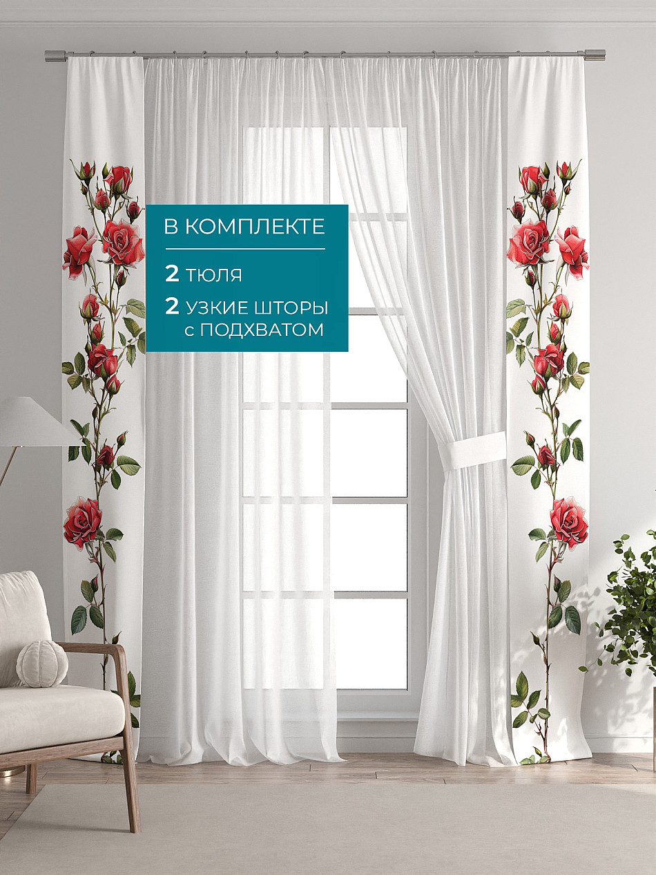 В комплект входят: - 2 полотна белого тюля шириной 150 см.. и высотой 260 см и - 2 узкие шторы шириной всего 38 см. и длиной 260 см., которые навешиваются рядом с тюлем не утяжеляя вид окна и не препятствуя попаданию солнечного света в комнату. При этом выполняют роль подхватов и добавляют акцент в интерьер.