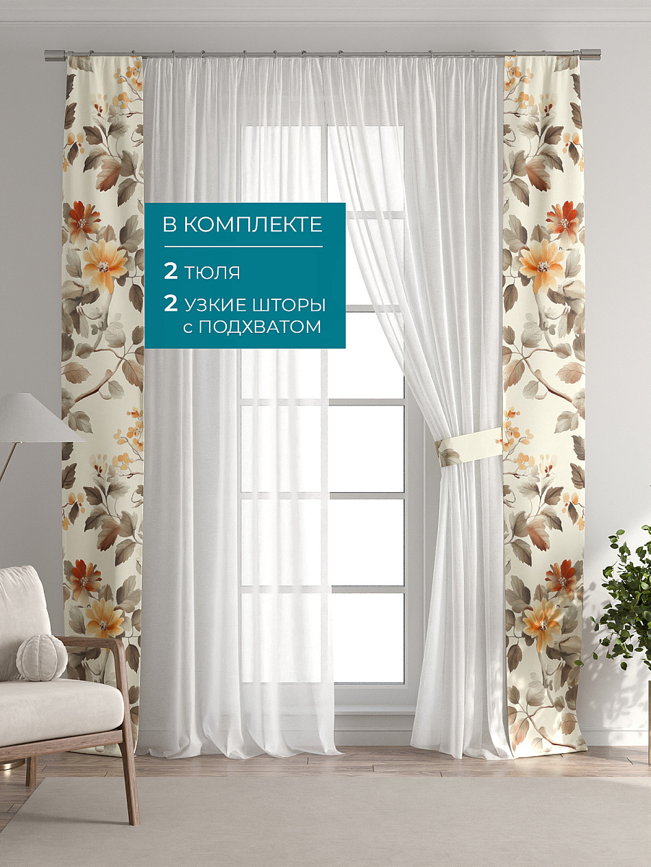 В комплект входят: - 2 полотна белого тюля шириной 150 см.. и высотой 260 см и - 2 узкие шторы шириной всего 38 см. и длиной 260 см., которые навешиваются рядом с тюлем не утяжеляя вид окна и не препятствуя попаданию солнечного света в комнату. При этом выполняют роль подхватов и добавляют акцент в интерьер.