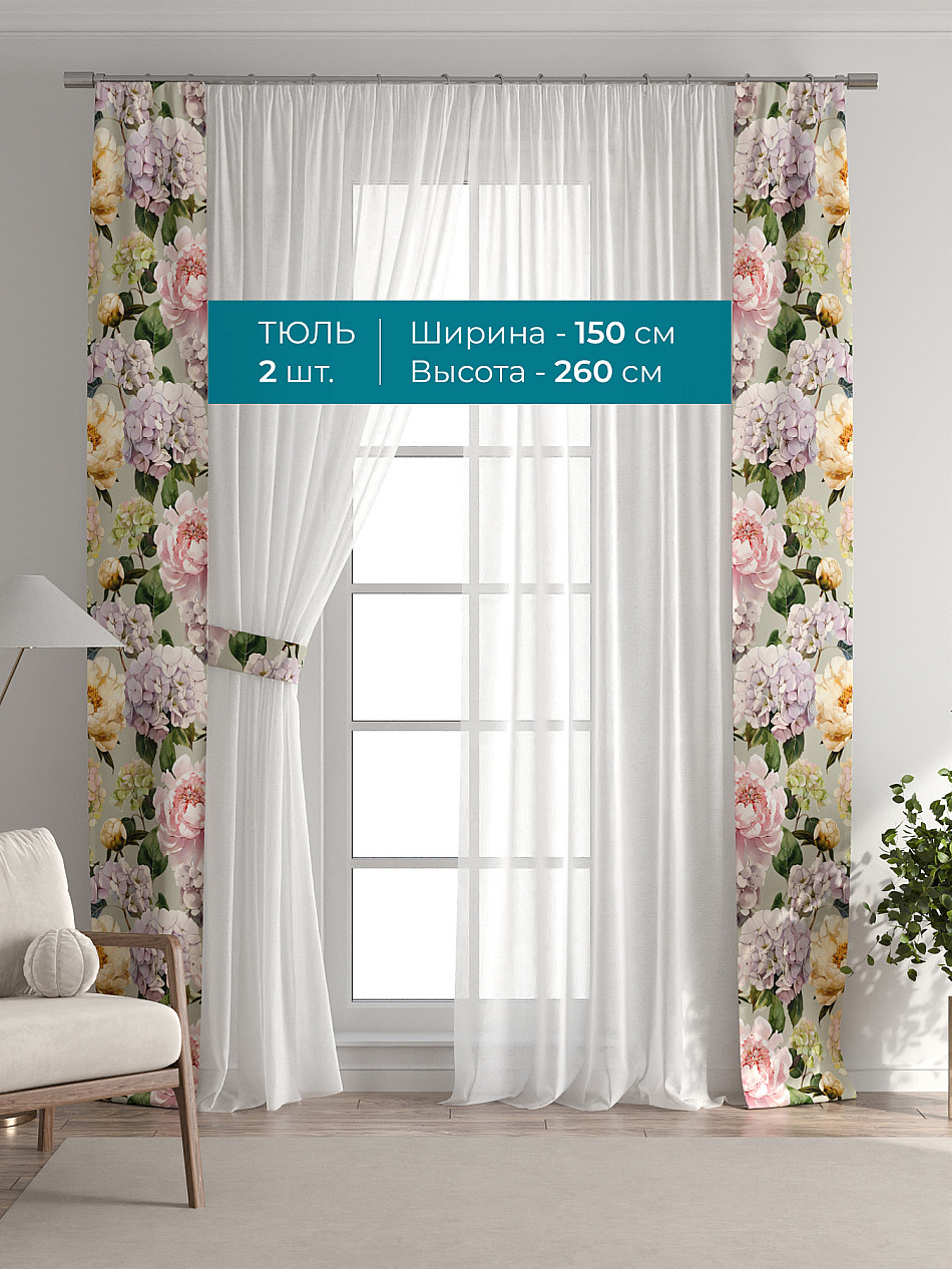 Декоративные подхваты 38х260 см — 2 шт.; Тюль 150х260 см — 2 шт. ( Изменить высоту) Крепление: шторная лента (крючки), кулиска Подробнее