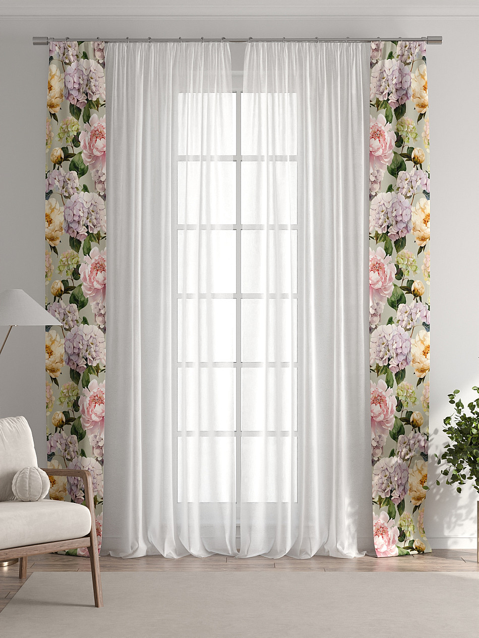 Комплект готов к развешиванию. По верхнему краю пристрочена шторная лента 6 см, с 2-мя рядами петель под крючки, что позволяет регулировать высоту. Одновременно имеется кулиска (карман для штанги), в которую можно продеть карниз любого диаметра.