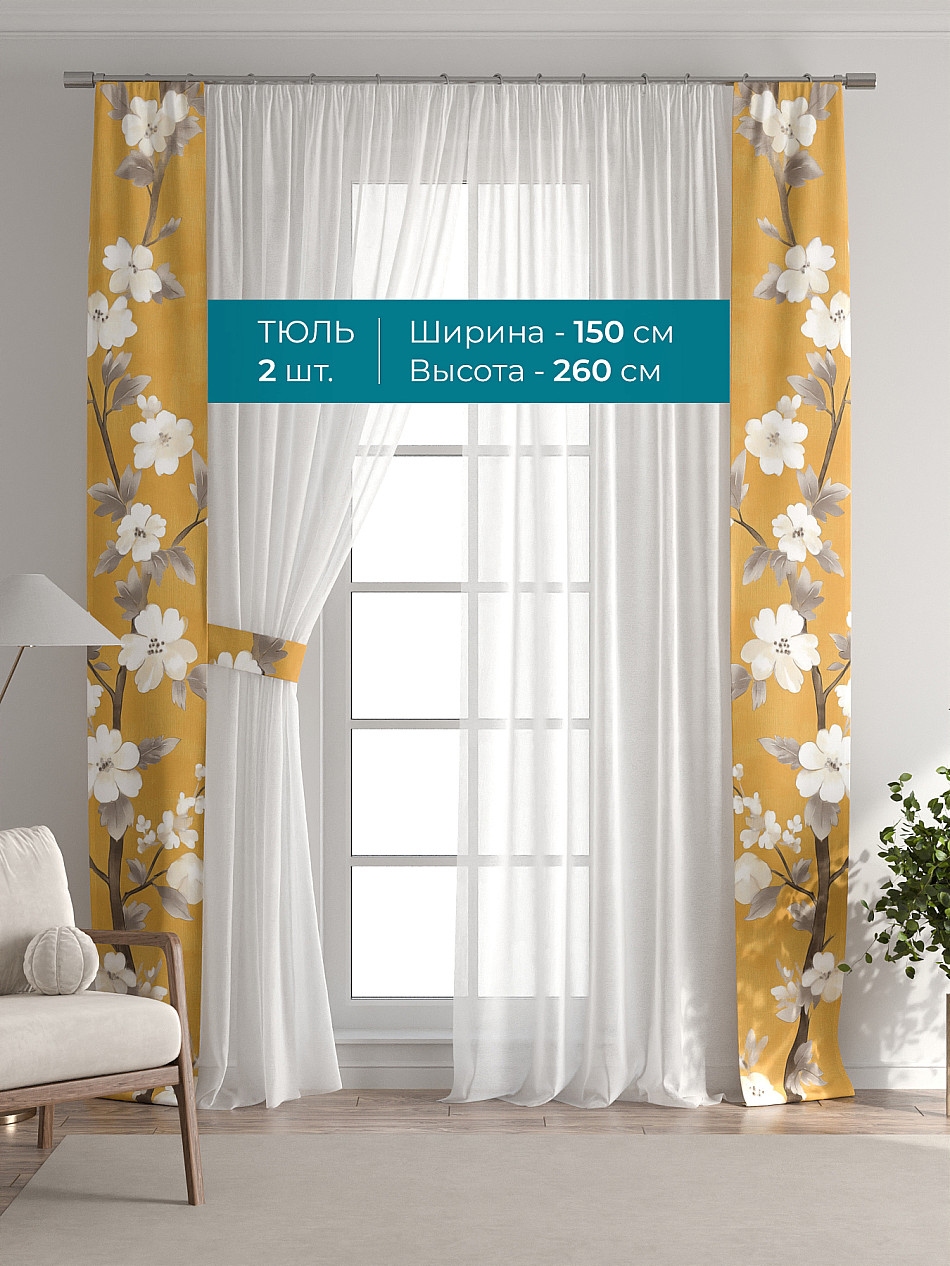 Декоративные подхваты 38х260 см — 2 шт.; Тюль 150х260 см — 2 шт. ( Изменить высоту) Крепление: шторная лента (крючки), кулиска Подробнее