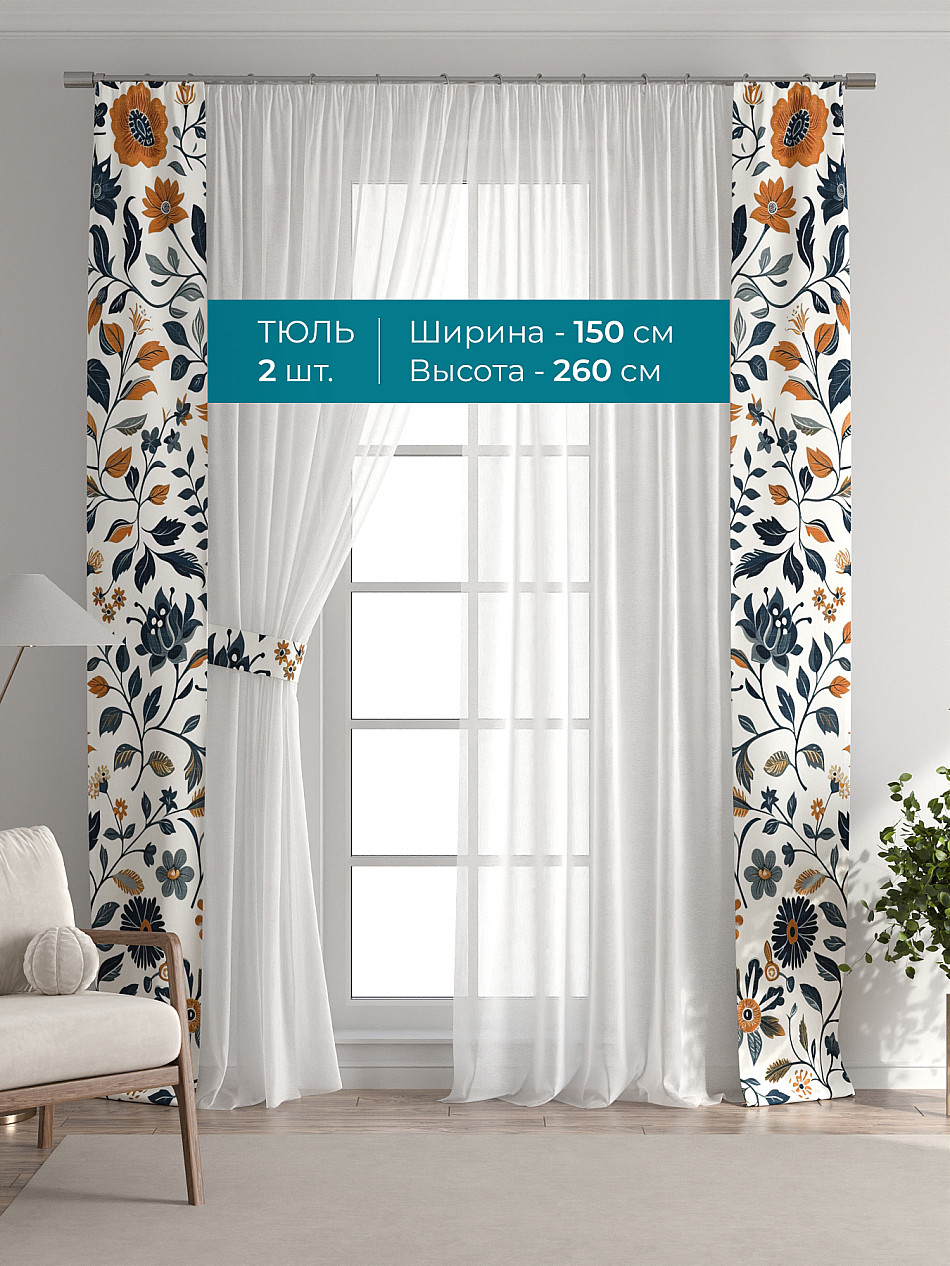 Декоративные подхваты 38х260 см — 2 шт.; Тюль 150х260 см — 2 шт. ( Изменить высоту) Крепление: шторная лента (крючки), кулиска Подробнее