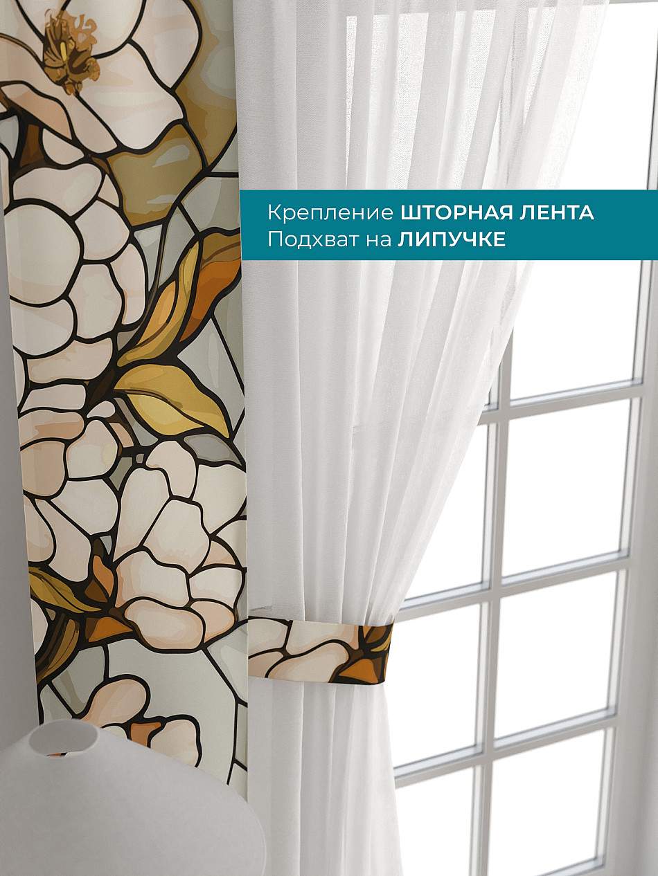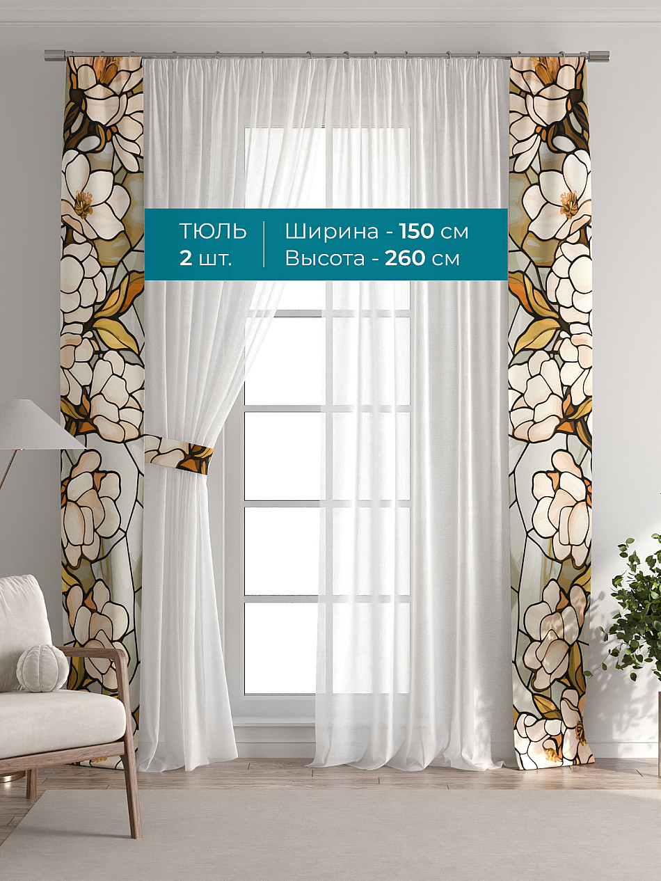 Декоративные подхваты 38х260 см — 2 шт.; Тюль 150х260 см — 2 шт. ( Изменить высоту) Крепление: шторная лента (крючки), кулиска Подробнее